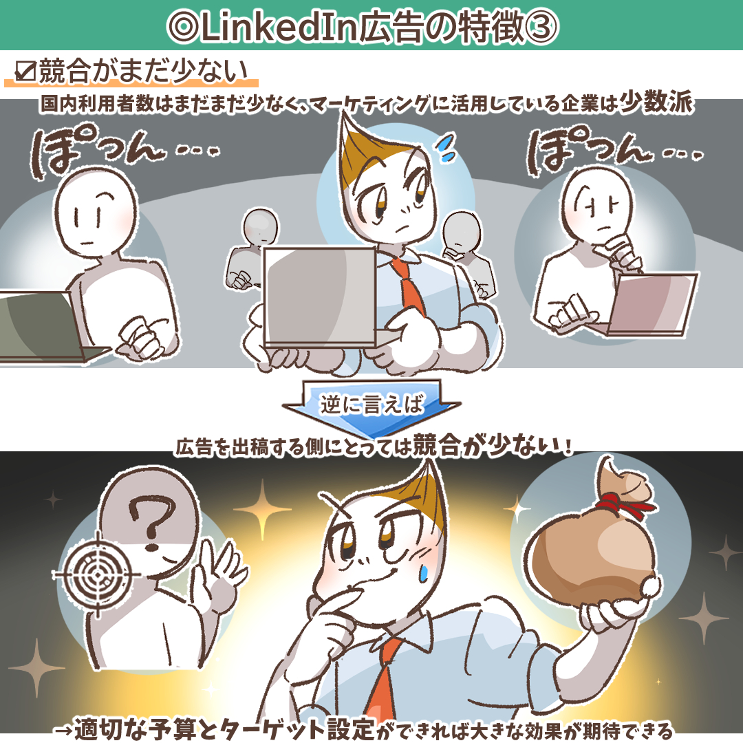 日本国内におけるLinkedInの利用者数は着実に増加しているものの、FacebookやTwitterといった巨大プラットフォームと比較すると、まだ発展途上の段階にあります。これは、広告を出稿する企業側にとっては大きなチャンスを意味します。つまり、他の主要な広告媒体に比べて、競合他社の数が少なく、広告の競争環境が比較的緩やかであるという点です。Google広告やFacebook広告では、人気のキーワードやオーディエンスセグメントにおいて、クリック単価(CPC)やインプレッション単価(CPM)が激しい入札競争によって高騰することが日常茶飯事です。しかし、LinkedIn広告では、特に日本市場においては、まだ「ブルーオーシャン(未開拓市場)」に近い状態のセグメントが多く存在します。これは、適切なターゲティングと魅力的なクリエイティブを用意できれば、比較的低いコストでターゲットオーディエンスにリーチし、高い広告表示シェアを確保できる可能性があることを示唆しています。競合がひしめくレッドオーシャンから一歩抜け出し、先行者利益を享受できる可能性がある点は、特に新規市場開拓やニッチな領域を攻める企業にとって、見逃せない大きなメリットと言えるでしょう。