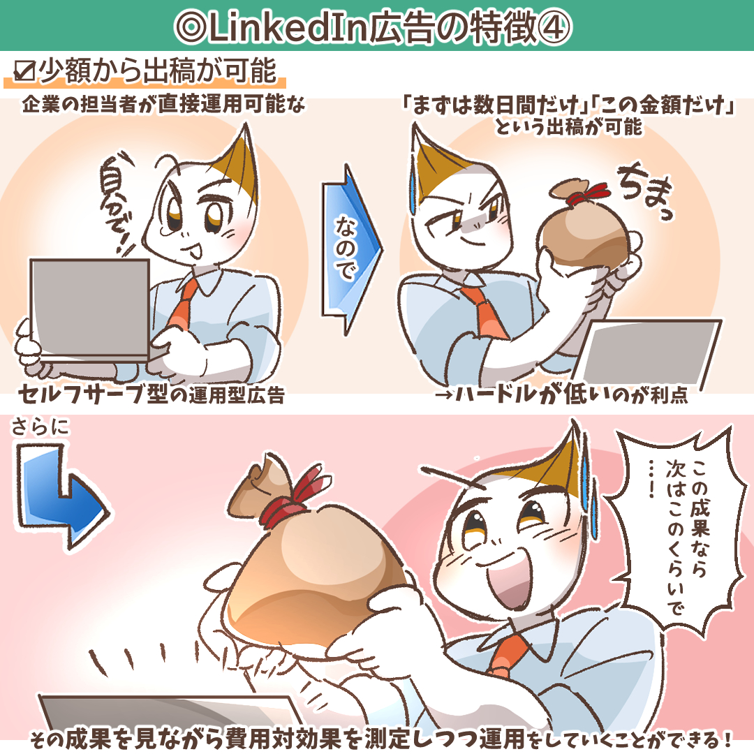 LinkedIn広告は、他の多くのSNS広告と同様、企業のマーケティング担当者が直接広告アカウントを管理・運用できるセルフサーブ型のプラットフォームです。これにより、広告代理店を介さずに、自社の判断で迅速にキャンペーンを開始、変更、停止することが可能です。最低出稿金額のハードルも非常に低く、例えば1日数千円といった少額の予算からでもテスト的に広告を配信することができます。「まずは少額で特定のオーディエンスの反応を見てみたい」「期間限定のキャンペーンに合わせて短期間だけ出稿したい」といったニーズにも柔軟に対応できます。さらに、キャンペーンマネージャーと呼ばれる管理画面では、広告の表示回数、クリック数、クリック率(CTR)、コンバージョン数といったパフォーマンスデータをリアルタイムで詳細に確認できます。このデータを分析することで、「どの広告クリエイティブが最も効果的か」「どのオーディエンスセグメントからの反応が良いか」といったインサイトを得ることができ、それに基づいて継続的にキャンペーンを最適化していくことが可能です。データドリブンなアプローチにより、費用対効果を測定しながら広告運用を進められるため、無駄な投資を避け、成果の最大化を図ることができるのです。