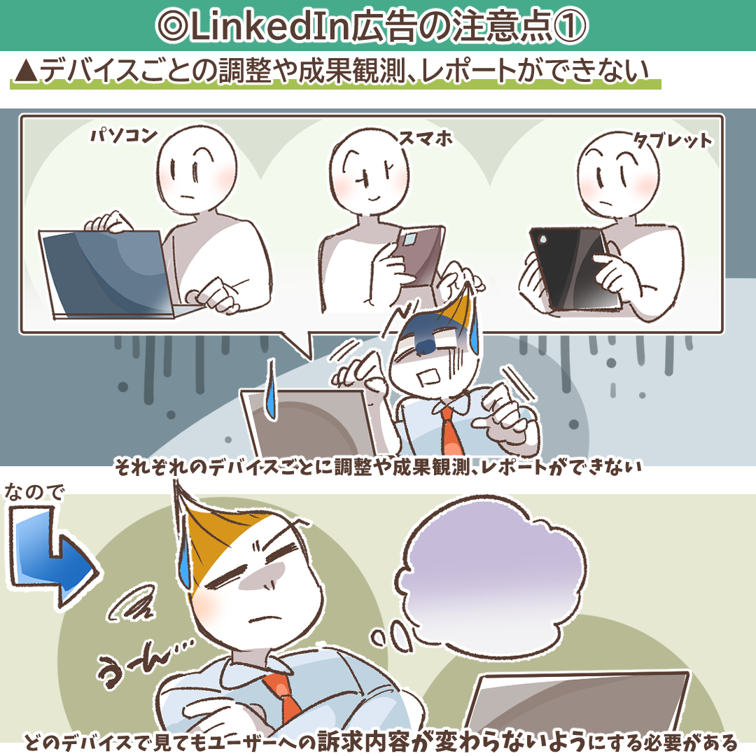 LinkedIn広告の運用上の制約の一つとして、広告の配信パフォーマンスをデバイス(PC、スマートフォン、タブレット)ごとに詳細に分析したり、デバイス別に予算配分を調整したりする機能が限定的であることが挙げられます。これは、例えば「PCからのコンバージョン率が高いので、PCへの配信を強化する」といった細やかな最適化が難しいことを意味します。この制約への対策としては、広告クリエイティブを作成する段階で、どのデバイスで見られても訴求内容が損なわれない「レスポンシブな設計」を心がけることが重要です。PCの横長の画面でも、スマートフォンの縦長の画面でも、主要なメッセージやブランドロゴ、コールトゥアクションが適切に表示され、ユーザー体験を損なわないようにデザインする必要があります。特に動画広告の場合は、縦長動画と横長動画の両方のフォーマットを用意したり、テキストやテロップの位置を工夫したりするなどの配慮が求められます。デバイスごとの成果が見えないからこそ、あらゆる閲覧環境を想定したユニバーサルなクリエイティブ作りが、機会損失を防ぐ上で不可欠となります。