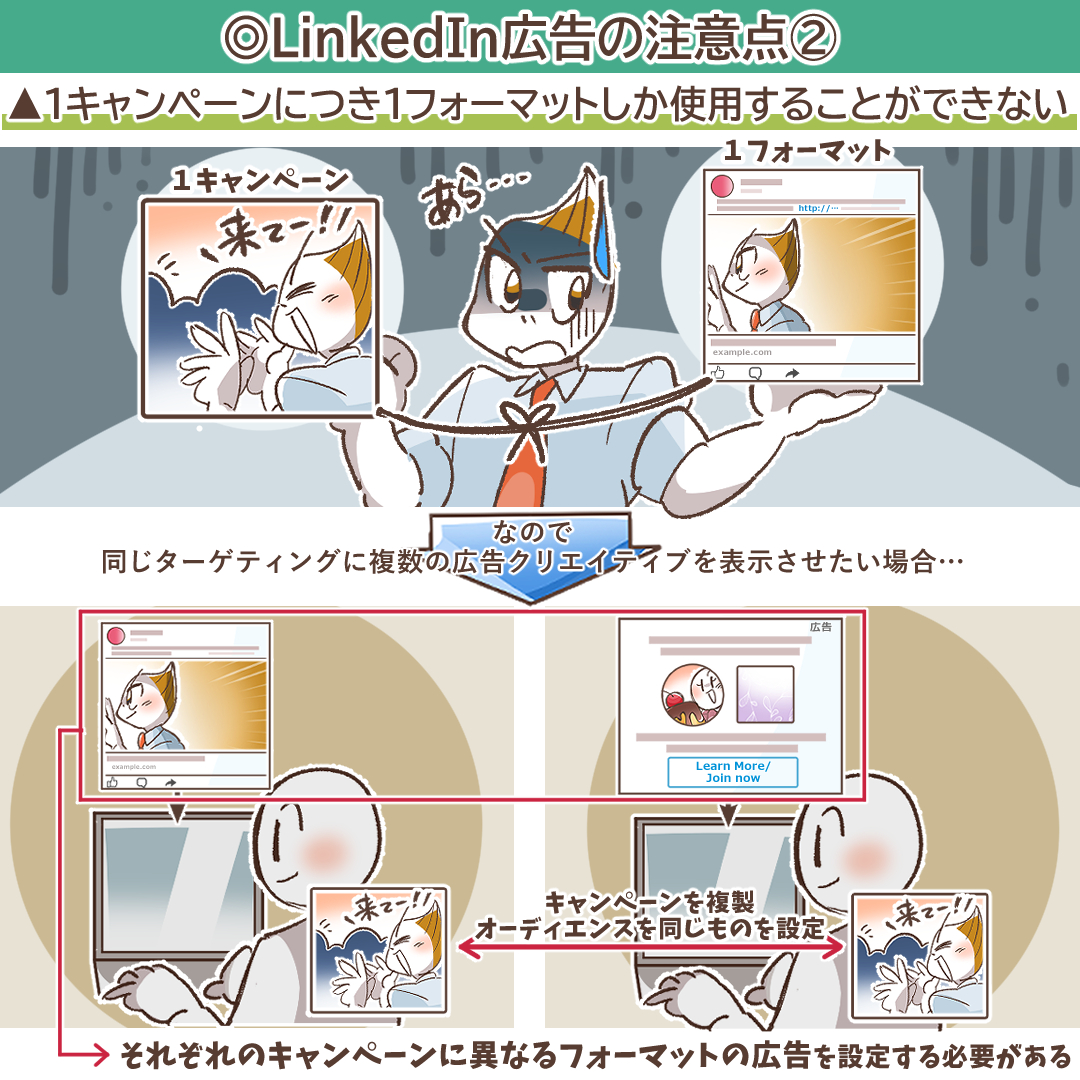 これは、他の多くの広告媒体とは異なる、LinkedIn広告の最も特徴的で、時に運用上の負担となり得る制約です。LinkedIn広告では、一つのキャンペーンに設定できる広告フォーマットは一種類のみ、というルールがあります。例えば、同じターゲットオーディエンスに対して、「シングル画像広告」と「動画広告」の両方を試したい場合、それぞれ別のキャンペーンとして設定する必要があります。これは、広告のABテストを行う際に、キャンペーンの数が増え、管理が煩雑になる可能性があることを意味します。この制約への対策としては、キャンペーンの命名規則を厳密に定め、管理しやすくする工夫が求められます。「【製品A】_【ターゲットB】_【動画広告】」のように、キャンペーン名を見ただけで内容が把握できるようにしておくことで、多数のキャンペーンを運用する際の混乱を防ぎます。また、最初にキャンペーンを複製する機能を活用し、オーディエンス設定などを引き継いだ上でフォーマットだけを変更することで、設定の手間を最小限に抑えることが可能です。この制約は一見不便に感じられますが、逆に言えばフォーマットごとに成果を明確に評価できるというメリットもあるため、構造を理解し、効率的な管理体制を整えることが重要です。