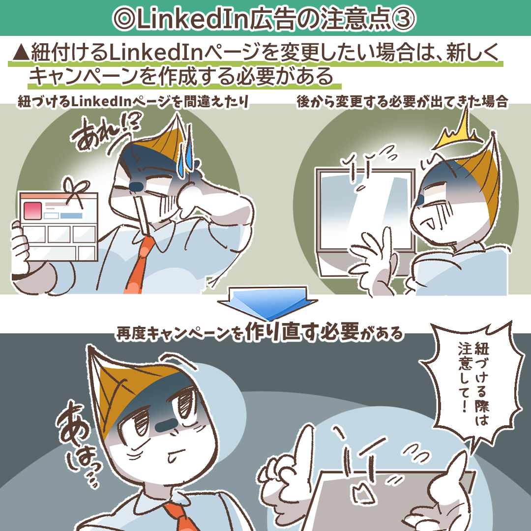 広告キャンペーンを作成する際、その広告の配信元となるLinkedInのカンパニーページ(またはプロモーションページ)を紐付ける必要がありますが、一度キャンペーンを作成・保存してしまうと、後からこの紐付けを変更することはできません。もし、紐付けるページを間違えてしまったり、運用方針の変更で別のページから配信したくなったりした場合は、残念ながらキャンペーンを一から作り直す必要があります。オーディエンス設定や広告クリエイティブの登録など、時間のかかる作業を再度行わなければならないため、これは大きな手間となり得ます。このリスクを避けるための唯一の対策は、キャンペーンを作成する最初の段階で、紐付けるページが正しいかどうかを複数回、慎重に確認することです。特に、複数の製品ブランドや事業部で異なるカンパニーページを運用している企業の場合は、間違いが起こりやすいため、ダブルチェックのプロセスを徹底することが極めて重要です。初歩的なミスに見えますが、後々の手戻りを考えると、この初期設定の確認は決して軽視できない注意点と言えます。