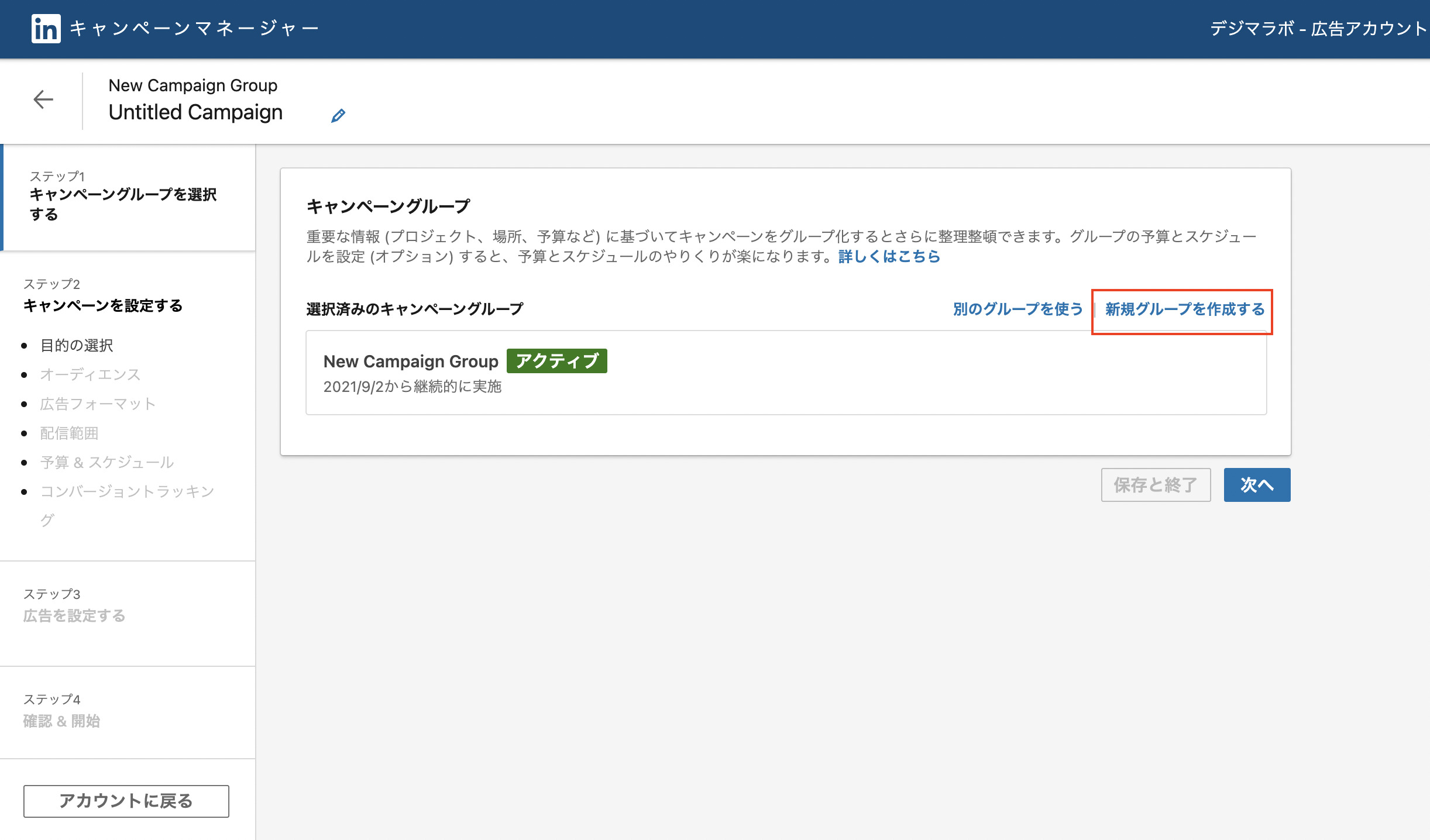 「 Default Campaign Group 」というキャンペーングループが作成されていますが、オフに変更することができないため新規に作成します。