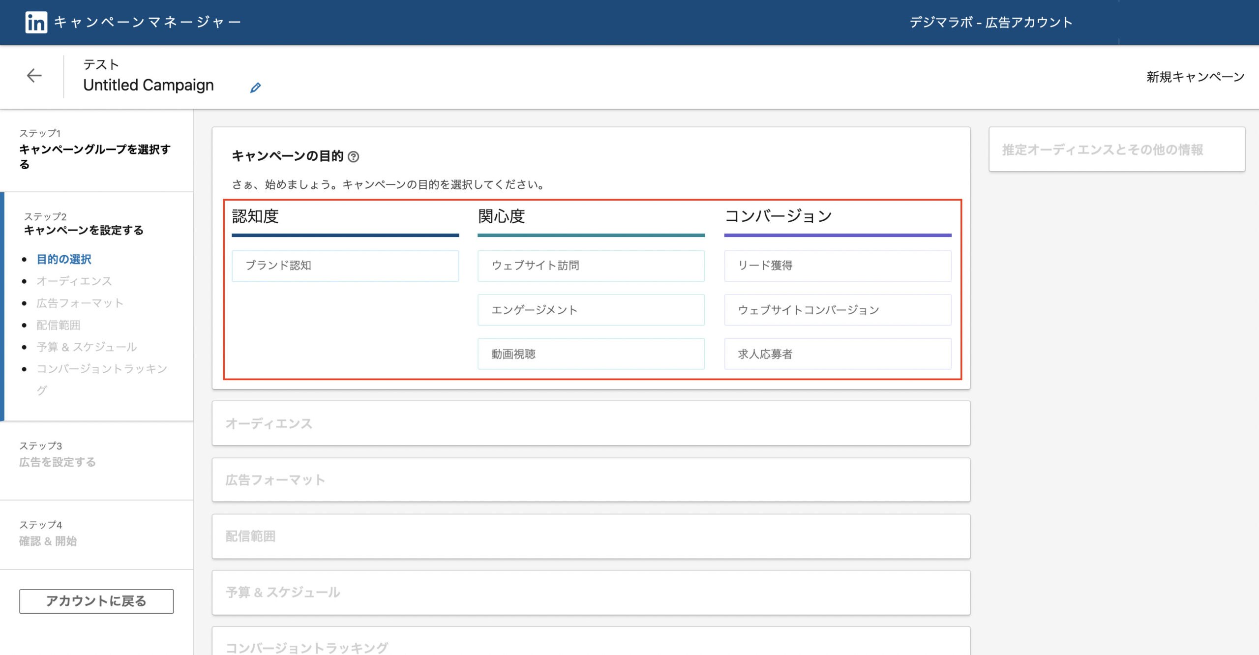 キャンペーンは、認識、検討、またはコンバージョン全体で、最も重要な目的を選択してください。