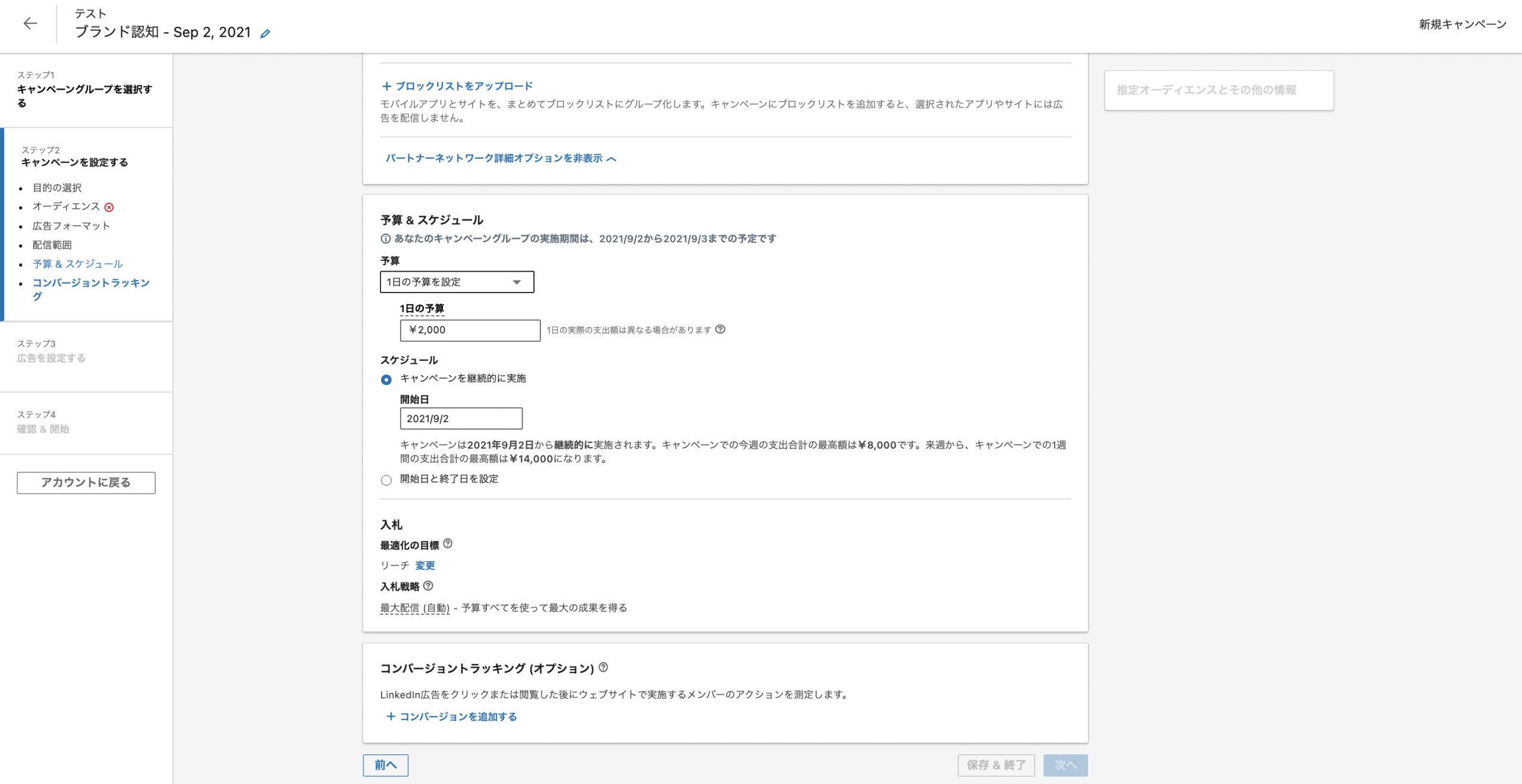 キャンペーンに適切なオプションを選択するとともに、推奨入札額、1日の予算、開始日、終了日、および合計予算を入力します。選択した終了日に関係なく、いつでもキャンペーンをキャンセルできます。こちら設定し右下のキャンペーンを開始する〔Launch Campaign〕をクリックしたら配信完了です。