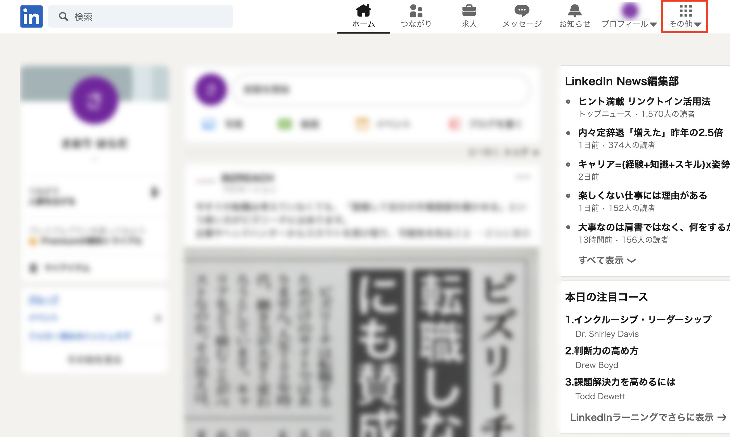 LinkedIn の個人アカウントのプロフィールページの右上にある[その他]をクリックし、inkedIn の製品ページのうち[広告掲載]を選択します。