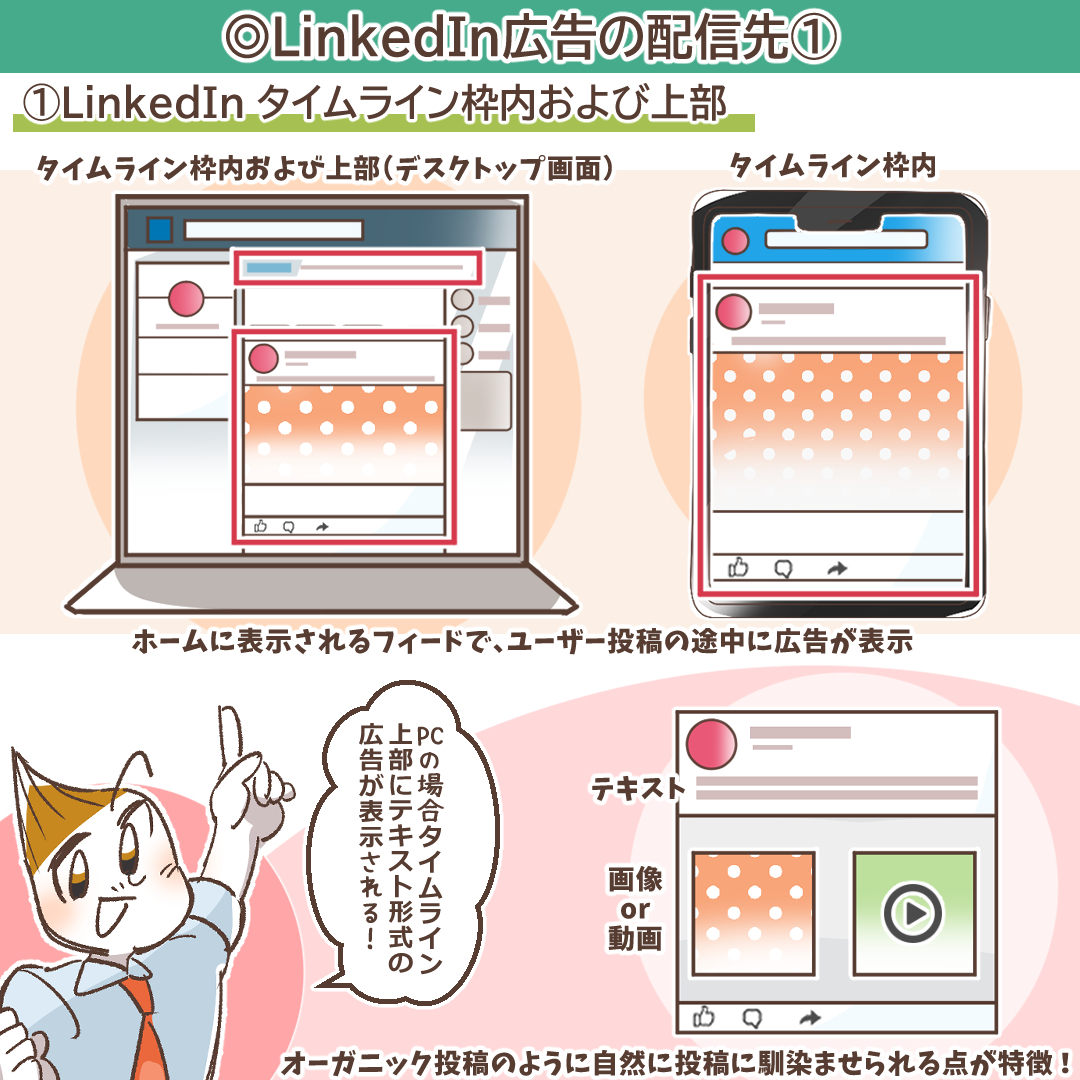LinkedIn広告は、ユーザーのプラットフォーム利用シーンに応じて、複数の戦略的な場所に表示されます。広告の目的やフォーマットによって最適な配信先は異なりますが、主に以下の3つのエリアに大別されます。これらの配信先を理解することは、広告クリエイティブの効果を最大化し、ターゲットユーザーに適切なタイミングでアプローチするための第一歩となります。
