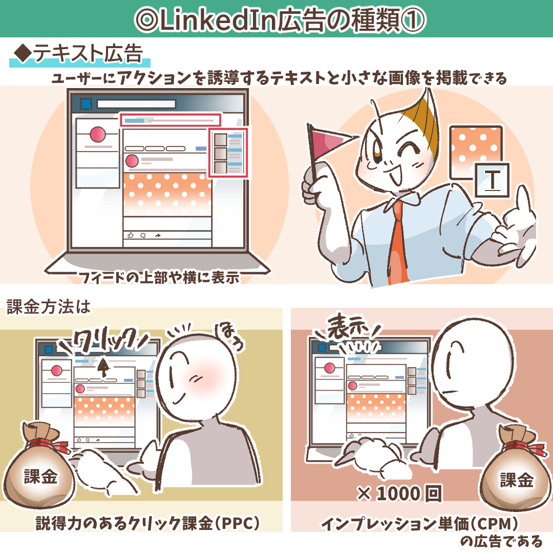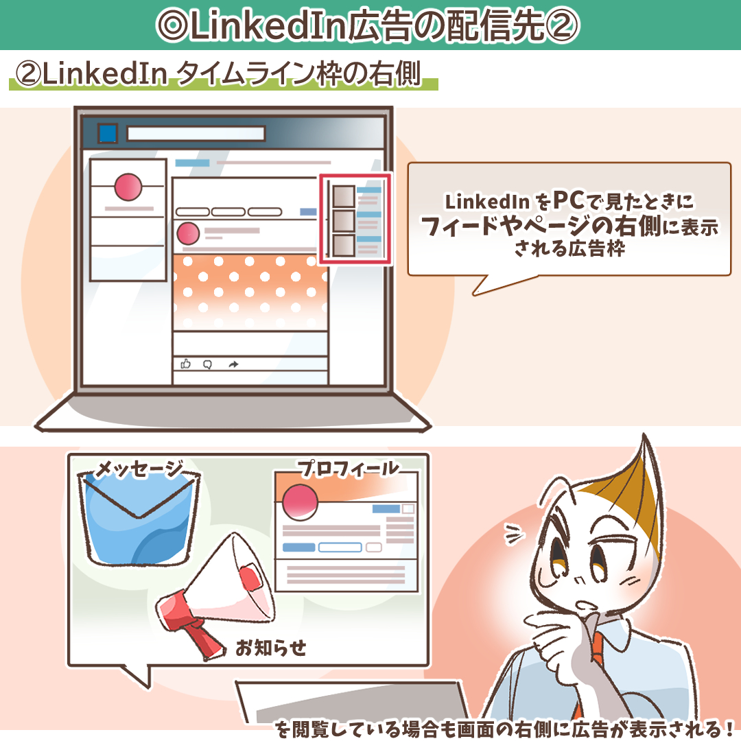 この広告枠は、主にPC(デスクトップ)版のLinkedInで表示されます。ユーザーがタイムラインを閲覧している際や、特定の企業ページ、個人のプロフィールを閲覧している際にも、画面の右側に常時表示されることが特徴です。タイムライン内の広告とは異なり、フィードの流れに埋もれることがなく、ユーザーが能動的に情報を探している間も、常に視界の片隅に存在し続けるため、繰り返しブランドやサービス名を刷り込む効果が期待できます。主にテキスト広告や、小さな画像とテキストを組み合わせたダイナミック広告(フォロワー広告など)が配信されます。情報量は限られますが、その分、簡潔で力強いコールトゥアクション(CTA)が求められます。「無料トライアルはこちら」「資料請求」といった直接的なアクションを促すメッセージや、自社ページのフォローを促す広告に適しています。常に表示されているという特性から、獲得ファネルの初期段階にいる潜在層へのアプローチというよりは、既にある程度の関心を持っているユーザーに対して、次のアクションを具体的に提示するリマインダーとしての役割が強いと言えるでしょう。