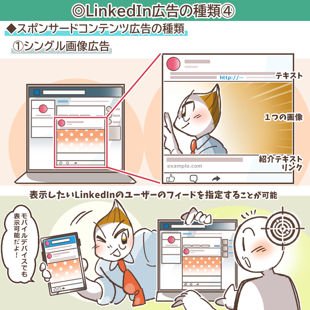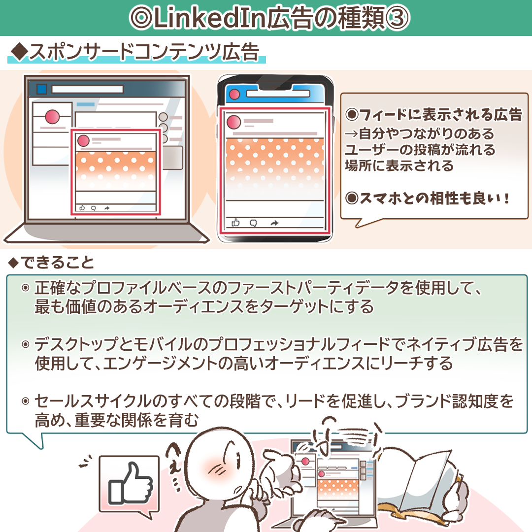 スポンサードコンテンツは、LinkedIn広告の中核をなす最も汎用性が高く、強力な広告カテゴリーです。前述の通り、ユーザーのタイムラインフィード内に、オーガニックな投稿と同じ形式で自然に表示されるため、広告色を抑えつつ、ターゲットに有益な情報としてコンテンツを届けることが可能です。このフォーマットの強みは、テキストだけでは伝えきれない製品やサービスの魅力を、画像や動画といったリッチなメディアを使って視覚的に、かつ深く訴求できる点にあります。BtoB商材は機能が複雑であったり、導入効果がイメージしにくかったりすることが多いため、この視覚的な訴求力はリード獲得において決定的な差を生み出します。例えば、製品の操作画面を映したデモ動画、顧客の成功事例をまとめたインフォグラフィック、業界の最新トレンドを解説したホワイトペーパーなど、ターゲットにとって価値のある「コンテンツ」を提供することで、単なる広告としてではなく、有益な情報源として認識され、エンゲージメントを高めることができます。デスクトップとモバイルの両方で最適に表示されるため、場所を選ばずターゲットにアプローチできるのも大きな利点です。このスポンサードコンテンツは、さらに複数の具体的なフォーマットに分かれており、目的に応じて最適な表現方法を選択できます。