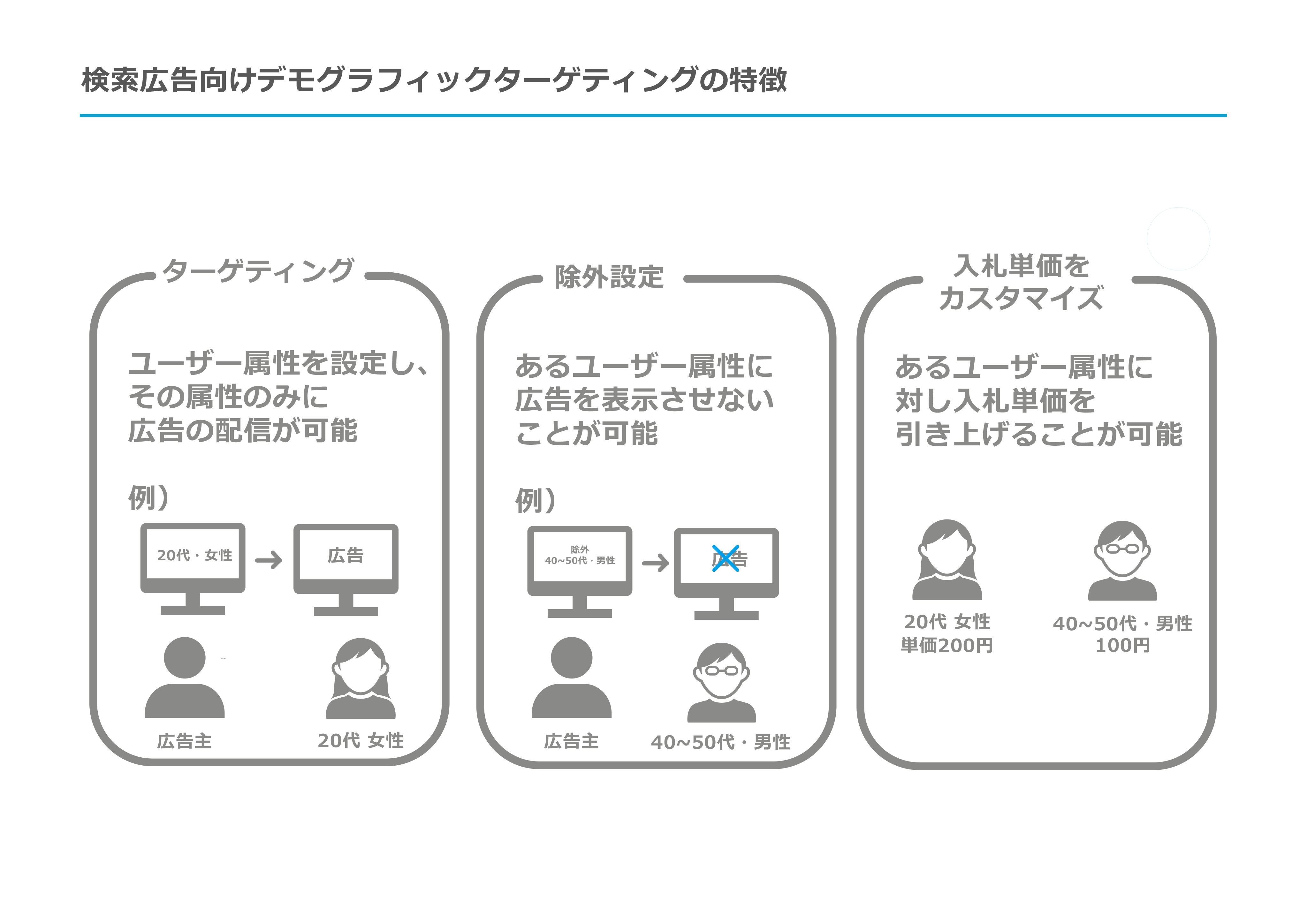 検索広告向けデモグラフィックターゲティング(以下、DFSA)とは、前述の通り、ユーザーの「検索キーワード」という能動的な意図に、「ユーザー属性(デモグラフィック情報)」という静的な情報を掛け合わせることで、広告配信の精度を高めるターゲティング手法です。具体的には、Google広告やYahoo!広告といった検索広告プラットフォームにおいて、特定の年齢層や性別、世帯年収などのセグメントに対して広告を配信したり、逆に対象から除外したり、入札単価を調整したりすることが可能になります。