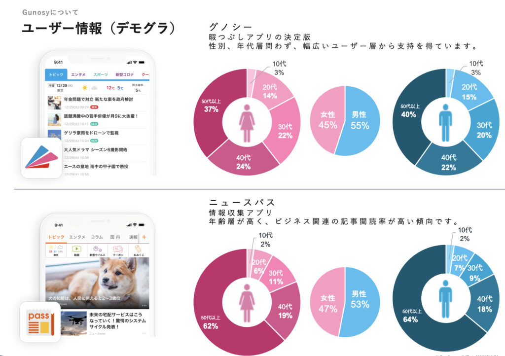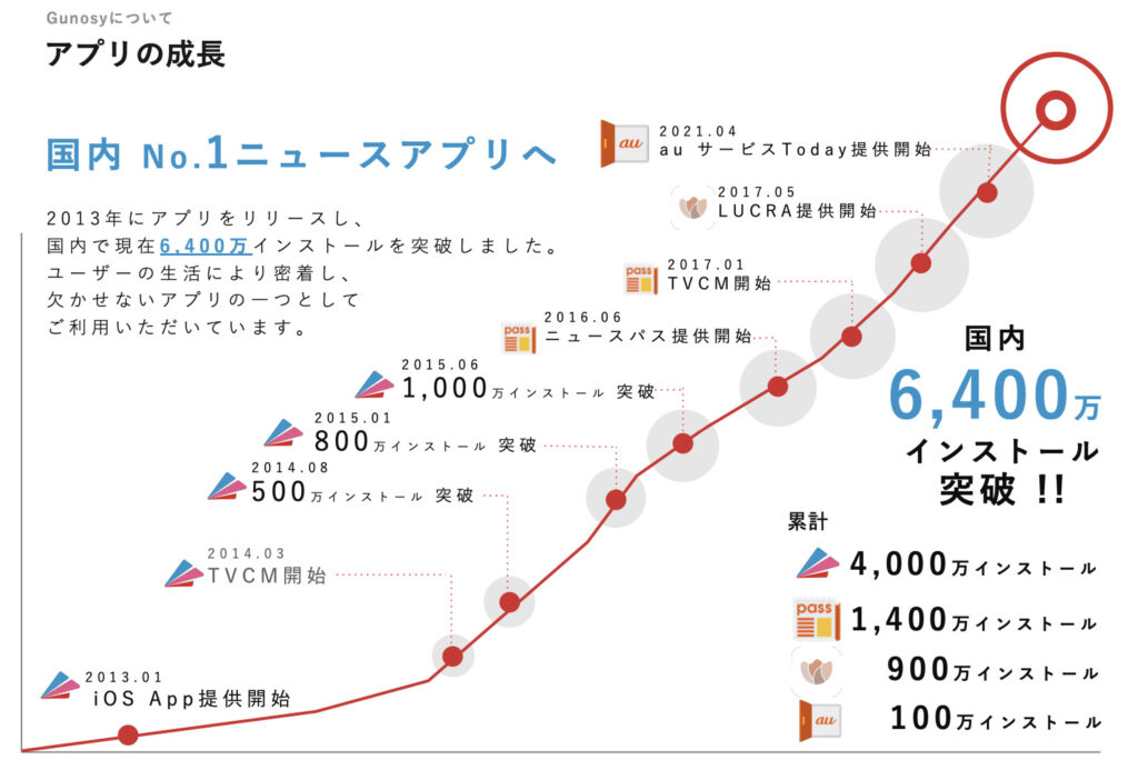 Gunosy(グノシー)とは株式会社Gunosyが提供するニュースキュレーションアプリのことを指します。世間のニュースやエンタメ情報に関する記事が、各々の興味関心に沿って徐々に最適化されて配信されるという特徴があります。またニュースアプリのGunosy(グノシー)だけではなく女性向けキュレーションアプリの「LUCRA」や、KDDI社と協業した「ニュースパス」についても同様に広告を配信することができます。国内でのMAUは公表されていないので、不明ですが、アプリの総計ダウンロード数は国内6400万を超え、3つのアプリを合わせ、様々な層のユーザーにアプローチできるプロダクトとなっています。