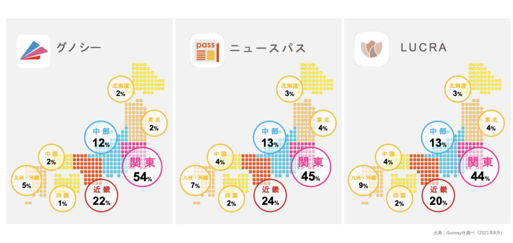 グノシーが特に関東圏での利用が高いことがわかります。その一方近畿圏での利用はニュースパスが僅差で高いということがわかります。しかし全国的なデモグラフィックは対して変わらず全体的に似ている傾向にあると言えます。