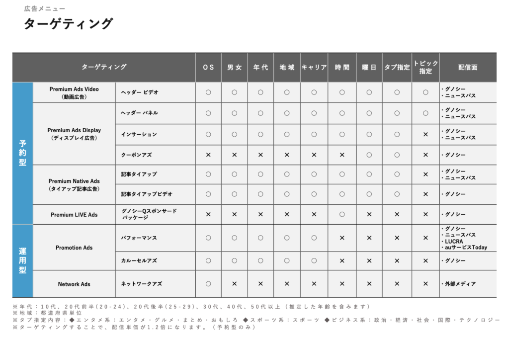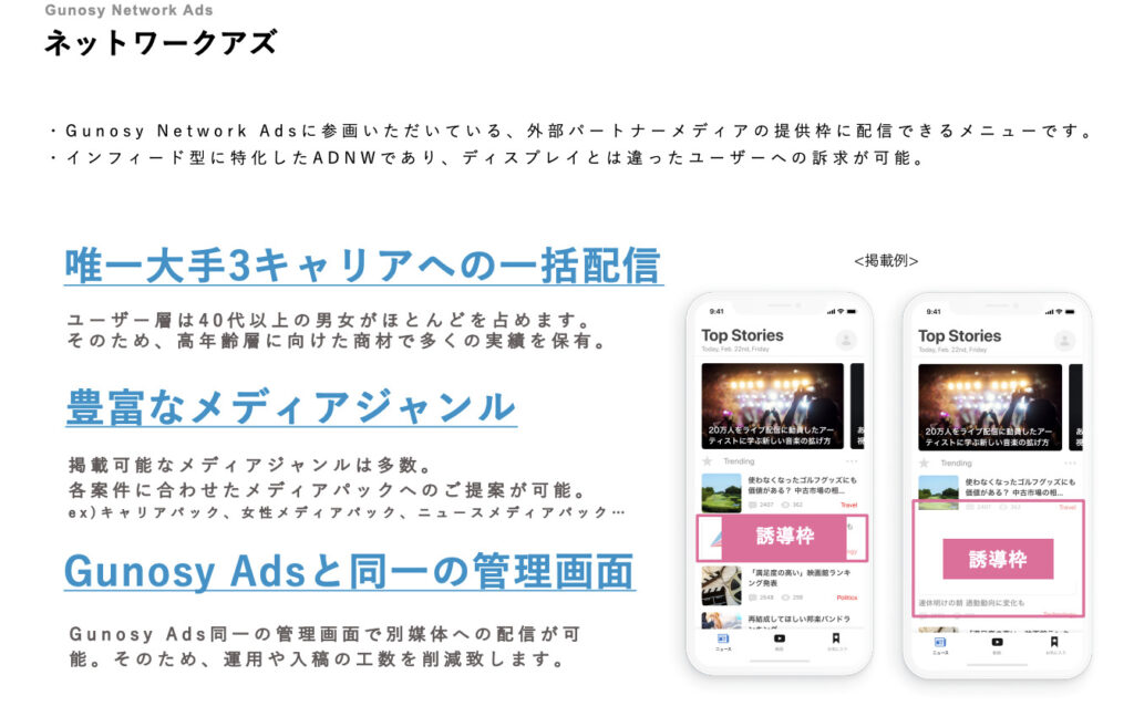 グノシー(Gunosy)が提携している外部パートナーメディアの提供枠に広告を配信できるメニューです。キャリアパックから女性向けのメディアなどさまざまなジャンルの掲載先があります。