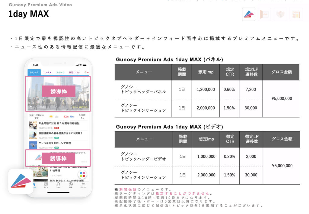 予約型については、「Gunosy Premium Ads 1day MAX」が該当します。その日、1日の枠を買い取る形での課金方式となります。具体的な掲載費用は掲載内容によっても異なりますが、数百万かかることがほとんどで、1day MAXでは500万円になっています。