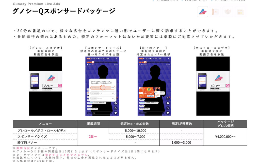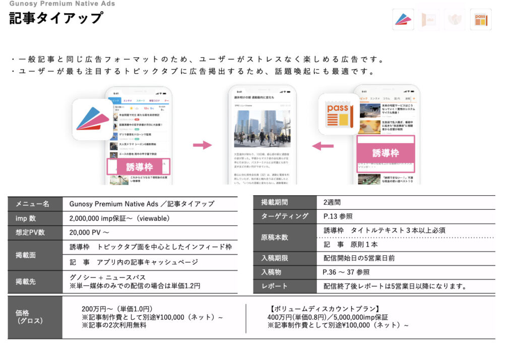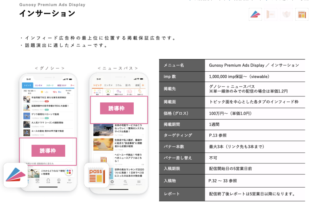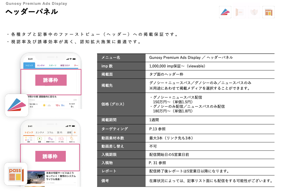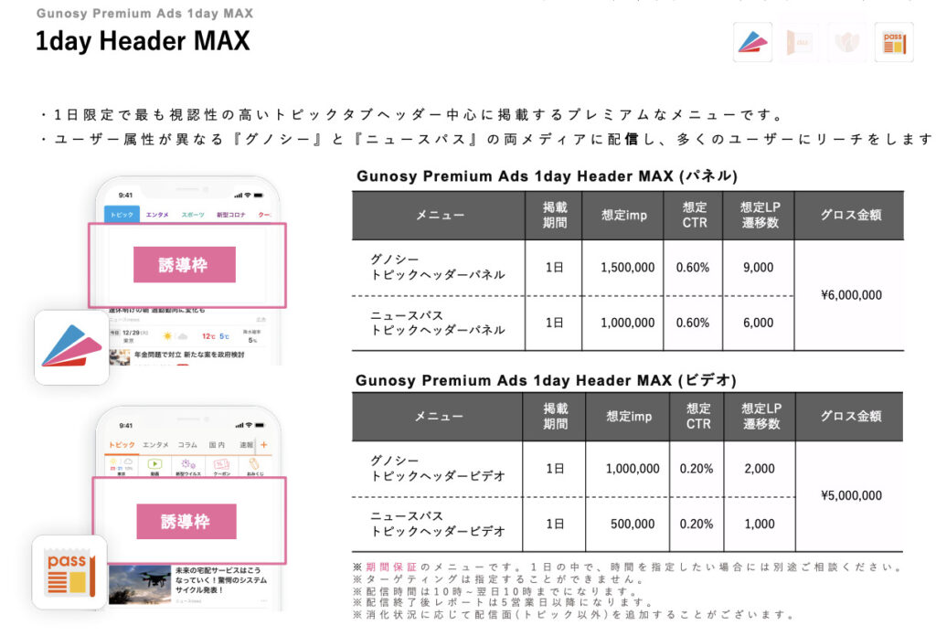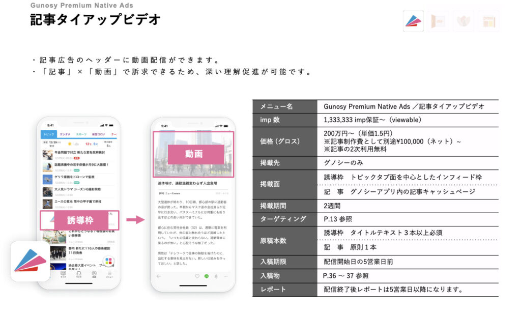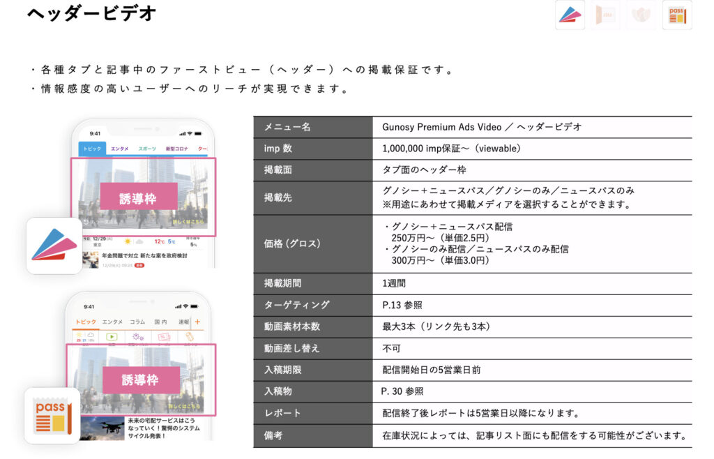 各種タブと記事中のファーストビュー(ヘッダー)へ動画配信広告を掲載するメニューです。広告が表示される回数を保証するインプレッション保証型広告となっていたり、配信する媒体を選択することができるなどかなり自由度の高い広告になっています。またグノシーに配信することので情報感度の高いユーザーへのリーチを期待することができます。