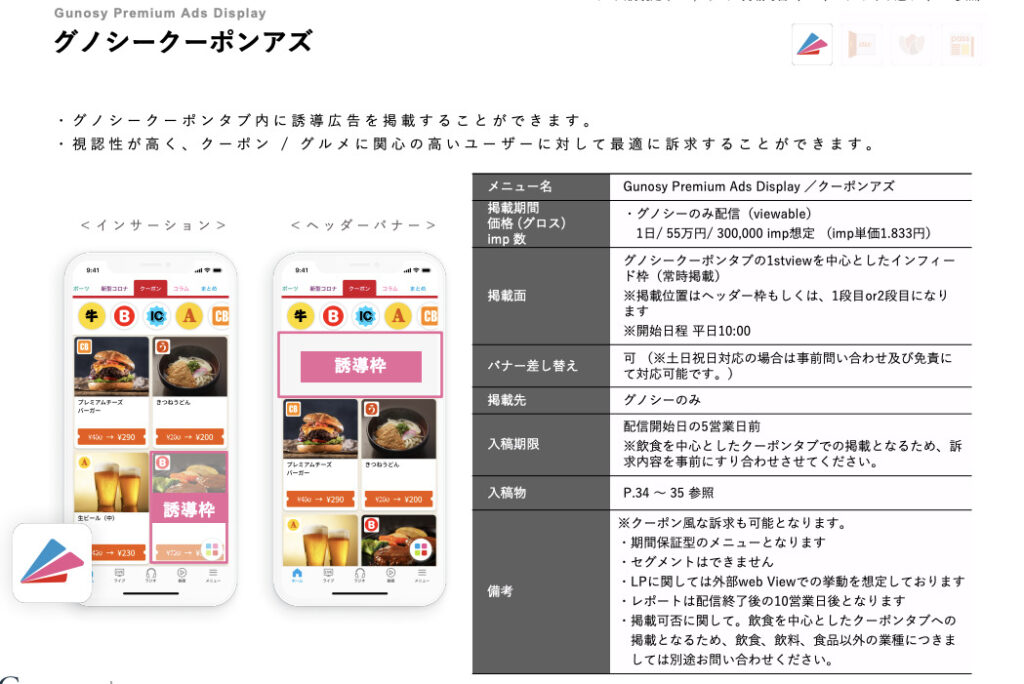 こちらはグノシーのクーポンタブ内にディスプレイ広告を配信することができるというものでした。誘導枠はすこし他の画像に比べると大きいのが特徴です。