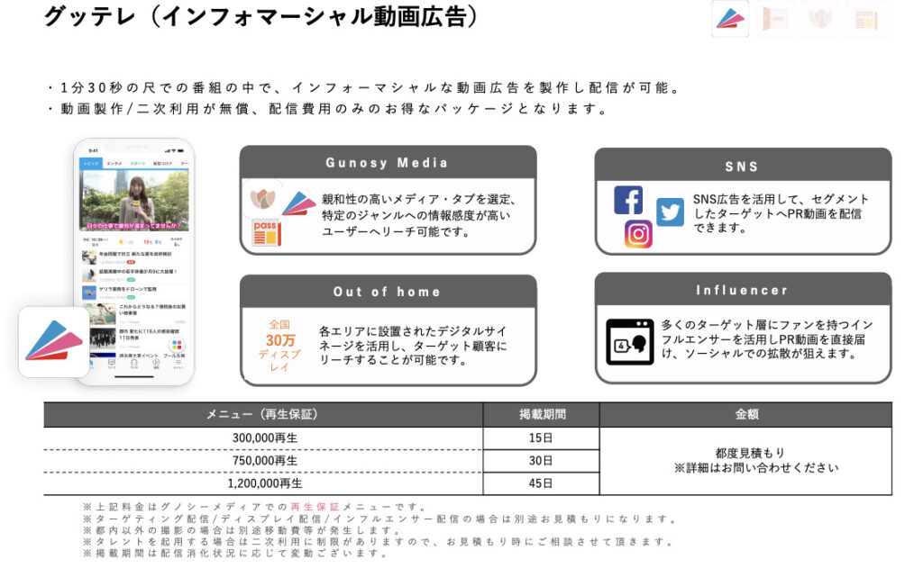 グッテレ(インフォマーショル動画効果)は1分30秒の尺での番組の中でインフォーマシャルな動画広告を制作し、配信することが可能になってくるというものになっています。動画制作や、動画の2次利用が無償であるなどの特徴があり、配信費用のみのお得なパッケージになっています。