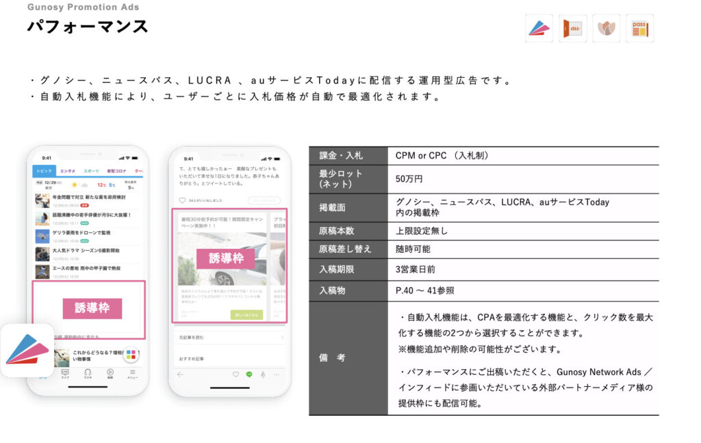 グノシー及びニュースパスに広告を配信することができる運用型広告です。運用型のため、ターゲットや予算や配信期間、配信方法をコントロールすることができます。また自動入札機能を使うことができたりとかなり柔軟に対応することができます。
