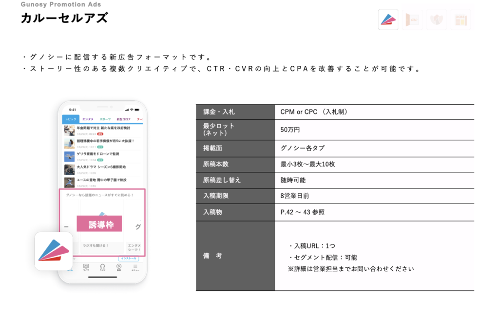 カルーセルアズはグノシーに配信することができる新広告フォーマットになっています。ニュースタブなどグノシーの各タブに出稿するメニューになっていますが、ストーリ性のある複数クリエイティブでCTRの改善や、CVRの向上などを期待することができます。イメージとしてはカルーセル広告に近いです。