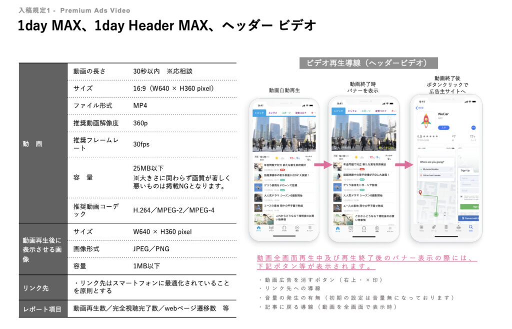 各種タブと記事中のファーストビュー(ヘッダー)へディスプレイ広告(画像やテキスト表示する広告)を掲載するメニューです。ヘッダービデオと同様にインプレッション保証型広告となっていたり、配信面を選択することができるなどかなり自由度の高い広告となっています。視聴率と誘導効果が高く、認知拡大施策に最適なメニューとなっています。