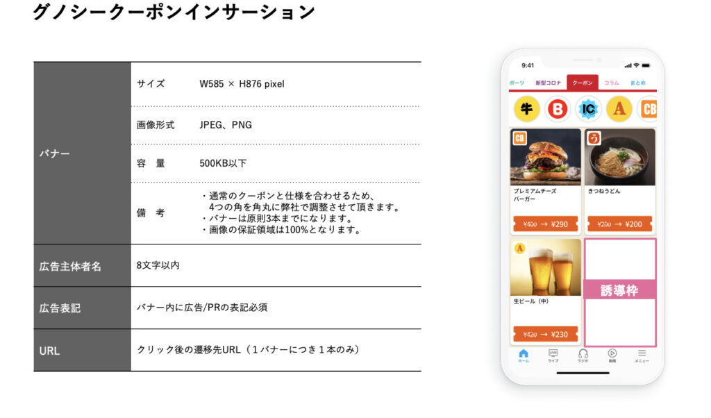 こちらはグノシーのクーポンタブ内にディスプレイ広告を掲載できるというものですが、画像の角が角丸に調整されるなど少しイレギュラーな対応があるので確認しておきたいです。