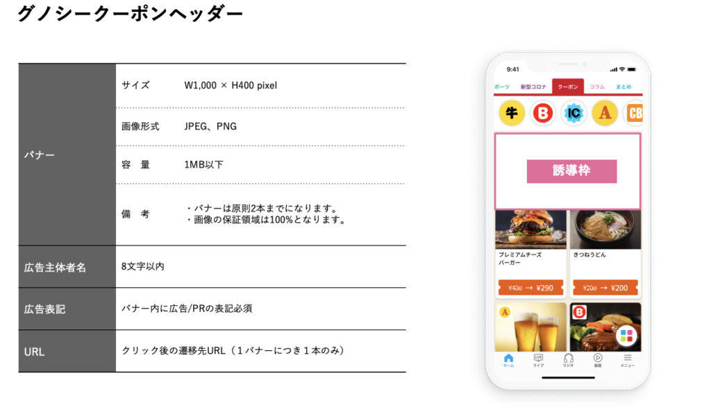 グノシーのアプリ内にある、クーポンページに誘導広告(クリックすると自社の広告ページに移動する広告)を掲載できるメニューです。視認性が高いこともあり、クーポン や グルメに関心の高いユーザーに対して目に留まりやすい広告枠です。