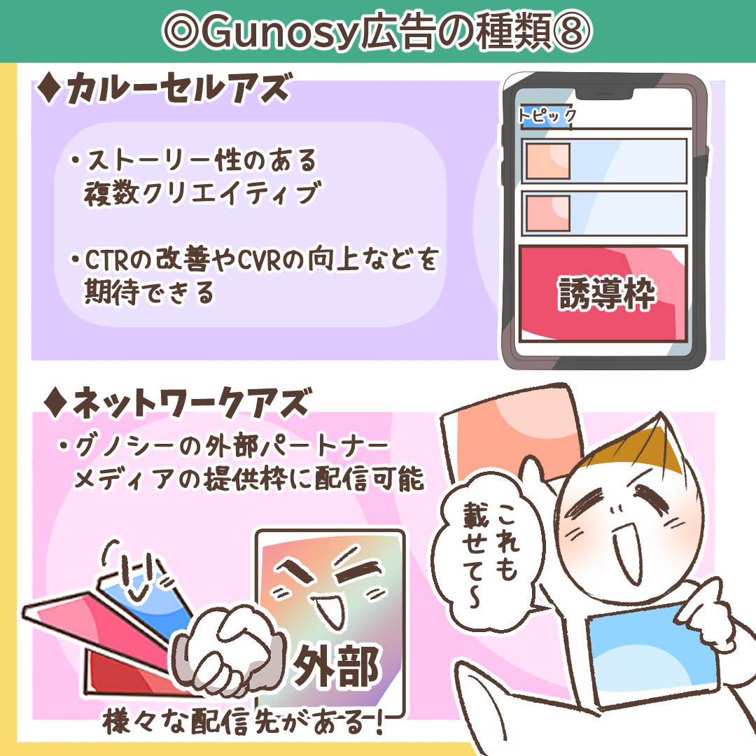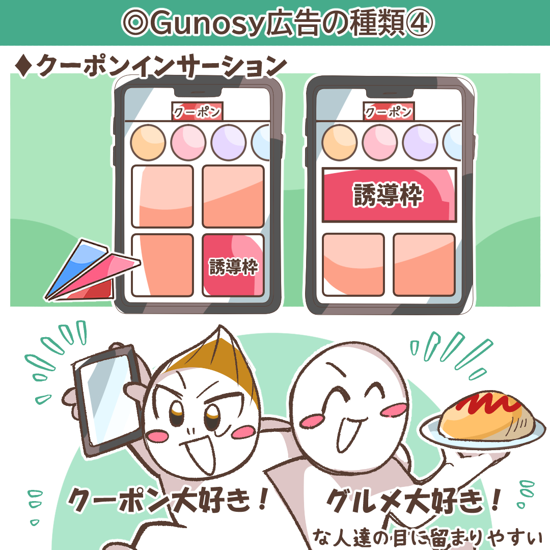こちらはグノシーのクーポンタブ内にディスプレイ広告を配信することができるというものでした。誘導枠はすこし他の画像に比べると大きいのが特徴です。