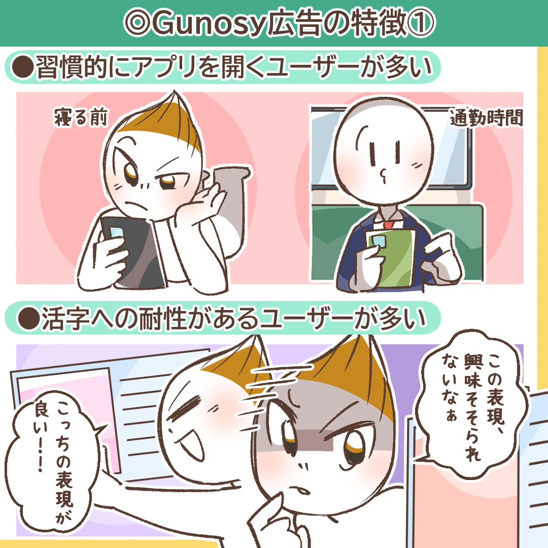 ニュースキュレーションアプリという特徴があるので、移動時間や休憩時間、寝る前などの空き時間や、速報性のあるニュースの通知が来た時など、隙間時間の決まったタイミングで何度も起動される傾向が強いです。サラリーマンの方が毎朝通勤時間にグノシーを開いてニュースに目を通る姿を想像していただけるとイメージがしやすくなるかと思います。常に一定量の広告表示が期待できるため、クリエイティブによる成果の変化を短いスパンで確認しやすく、うまく運用することが求められています。