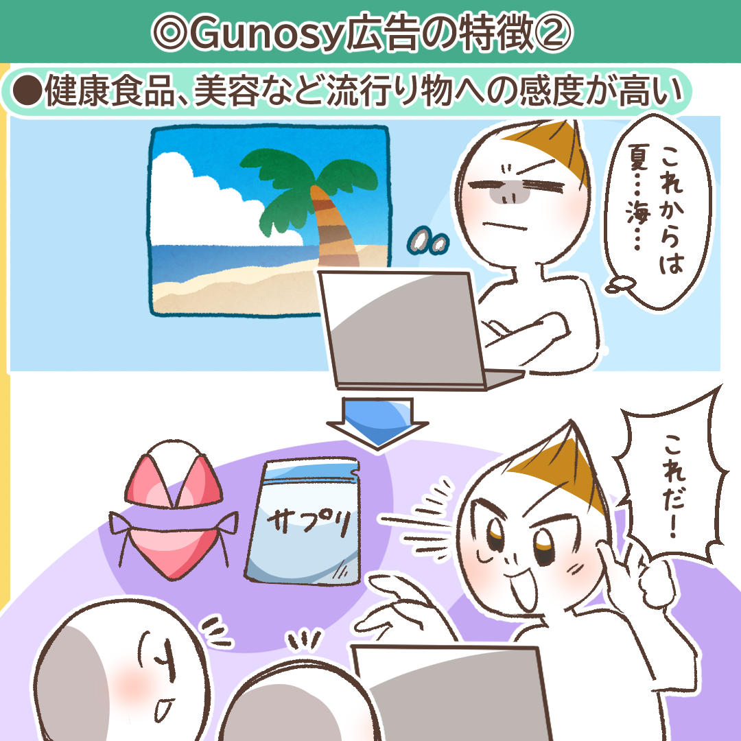 グノシー内に掲載せれているコンテンツの特性上、情報の鮮度が重要になってきます。そのため夏に向けた美容健康商材などタイムリー性の高いものや、娯楽ツールなどエンタメ的見せ方ができるものなど、傾向といコンバージョンハードルの低い商材や、コンバーションまでの距離が近いサービスなどに対しては反応が良い傾向があります。反対に、購入までの検討距離が長いサービスなどは反応が悪くなる傾向にあります。またニュースパスや、LUCRAなどにも出稿できることを考えると女性をターゲットとした商材が多いという傾向があります。