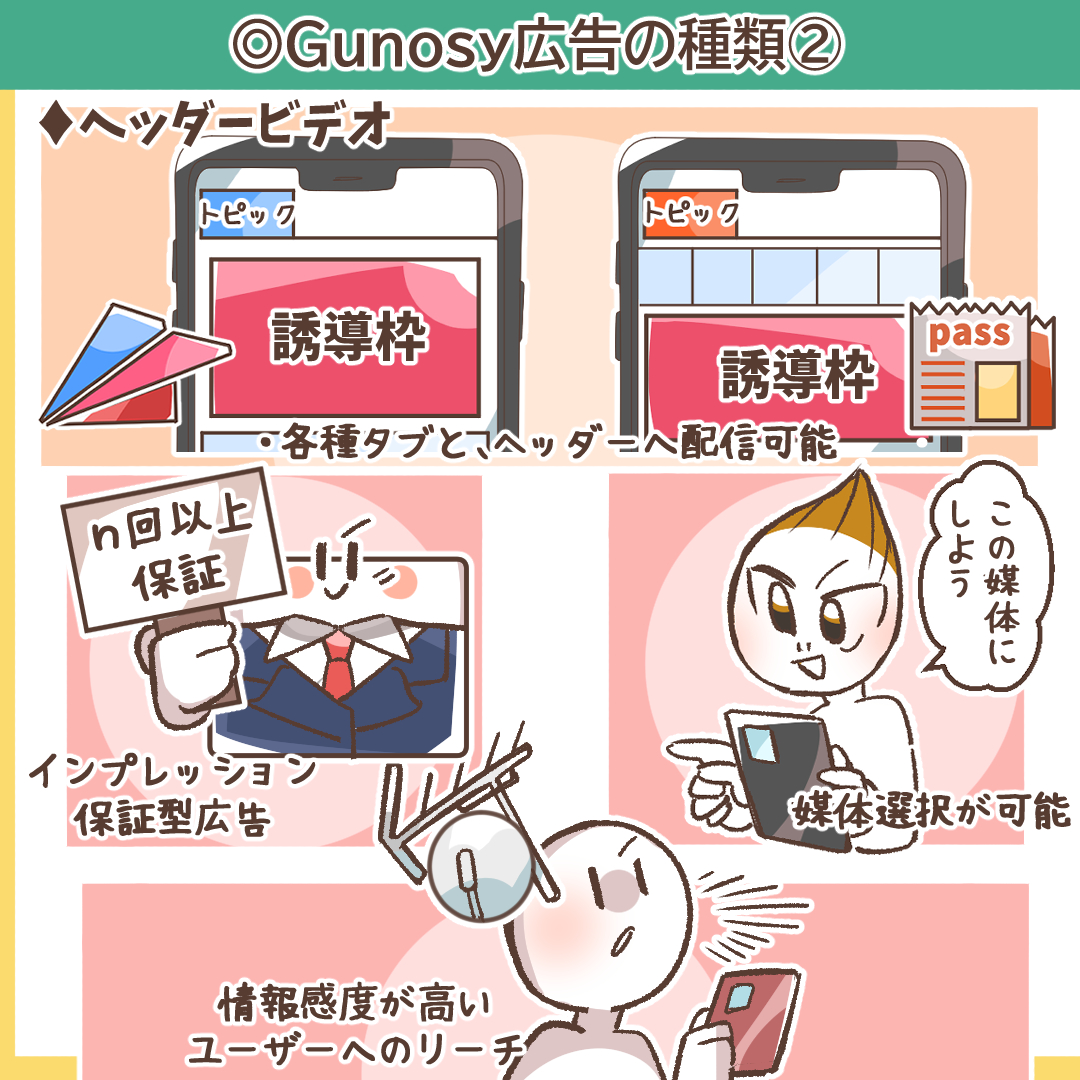 各種タブと記事中のファーストビュー(ヘッダー)へ動画配信広告を掲載するメニューです。広告が表示される回数を保証するインプレッション保証型広告となっていたり、配信する媒体を選択することができるなどかなり自由度の高い広告になっています。またグノシーに配信することので情報感度の高いユーザーへのリーチを期待することができます。
