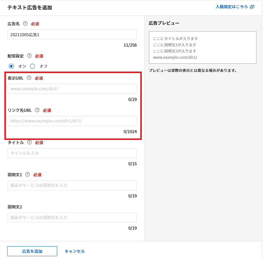 今回のアップデートで影響を受ける点は主に以下の画像の箇所となります。(今回はテキスト広告の設定画面を例とします。)