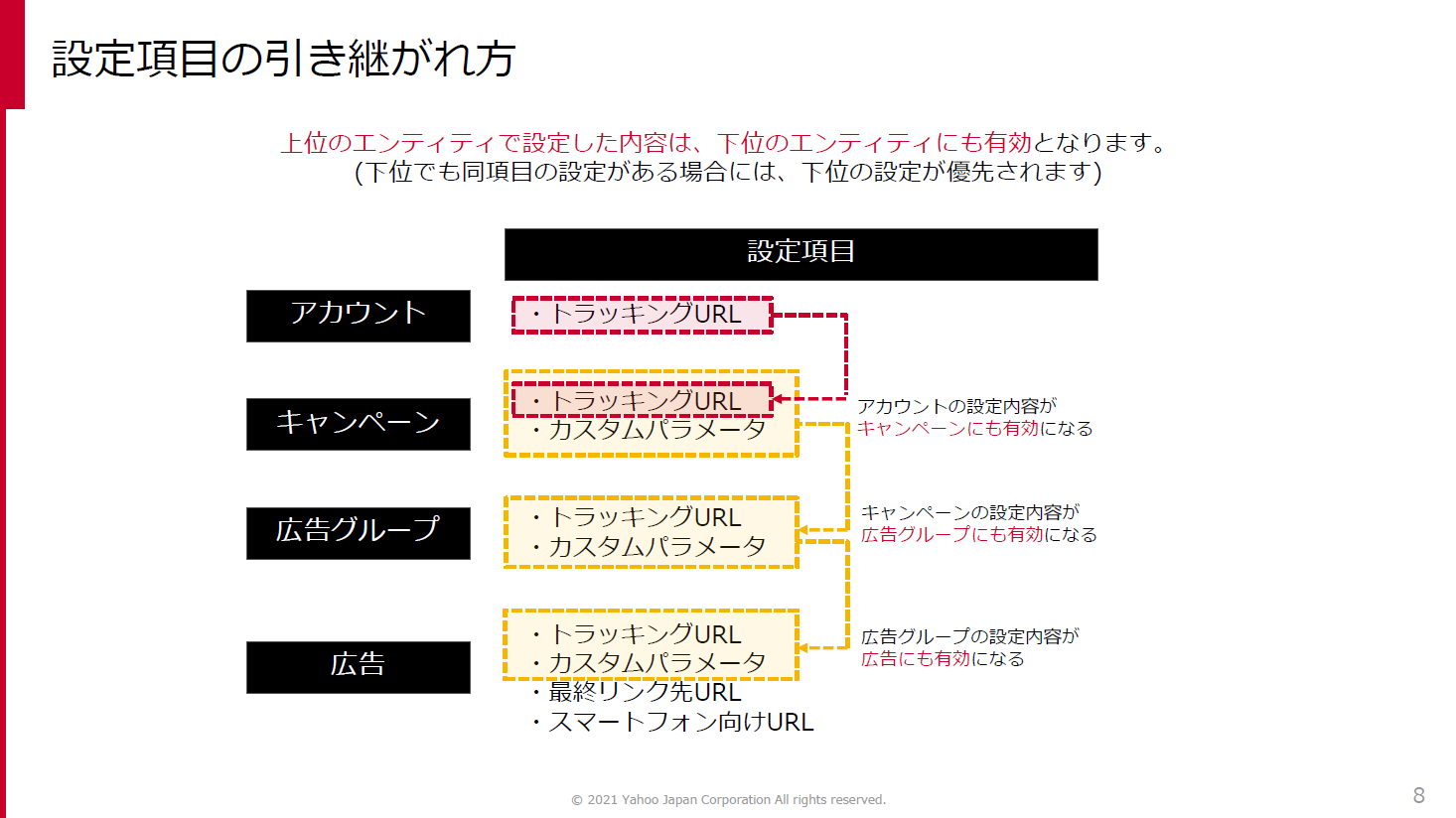 トラッキングURLとカスタムパラメータについてはそれぞれアカウント配下、およびキャンペーン配下の各階層に設定可能であり、また上位エンティティの設定は下位のエンティティに引き継がれるようになります。