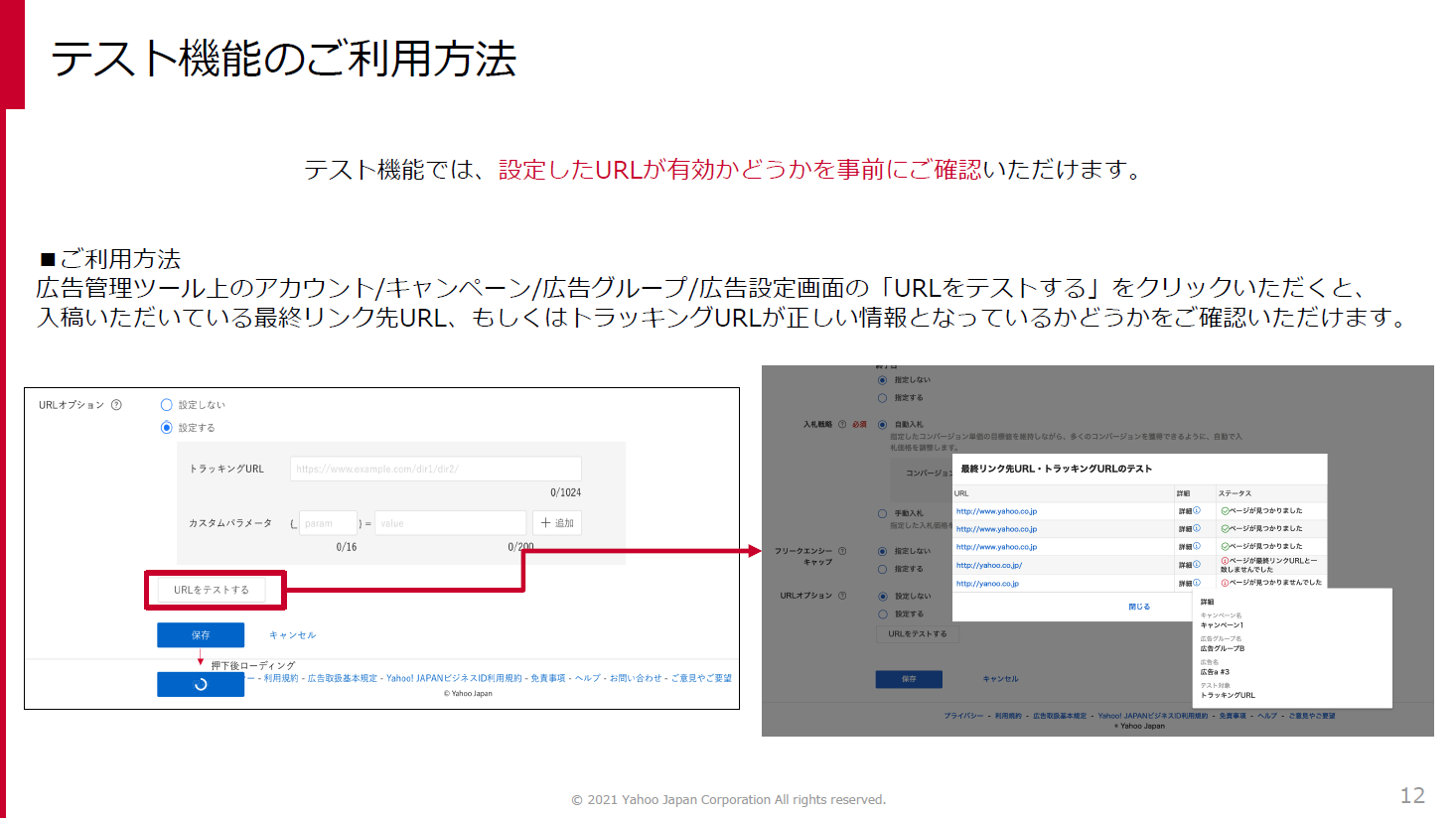 注意点として、テスト機能で表示されるURLは最大10件までであるということ、そしてテスト機能はページへの遷移可否についてのみチェックするものであるため、ポリシー抵触などの際には配信自体が不可となる場合があるということが挙げられます。