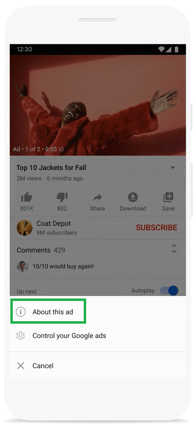 強化された広告の開示性は、Google上で広告を目にするユーザーに対して明確で直感的なエクスペリエンスを提供するための我々の努力によって形作られています。日々広告の透明性やコントロールメニューに関わるユーザー数は30億以上にものぼりますが、"About this ad"による能率化されたエクスペリエンスへのフィードバックはどれも好意的なものです。ユーザーは特にYouTube上で広告の透明性とコントロールツールを目にするでしょう。エンゲージする場所に関わらずユーザーが情報に基づく決断ができるよう、”About this ad"機能は翌数ヶ月のうちにYouTubeとGoogle検索上で利用可能になります。