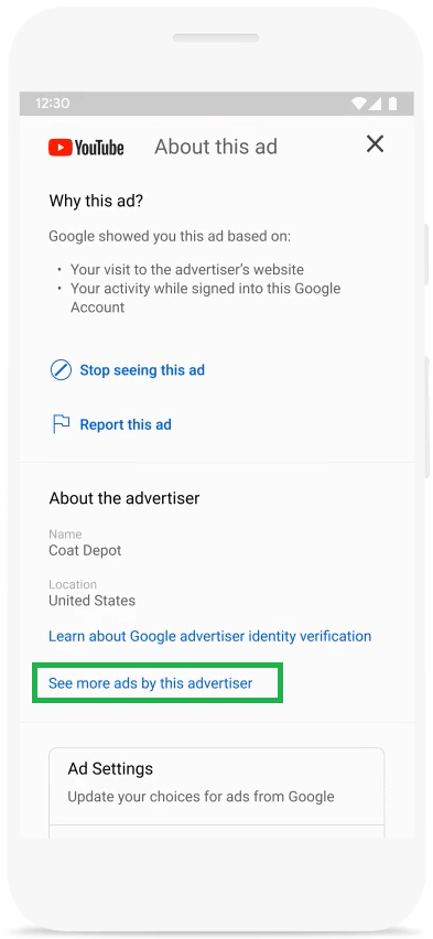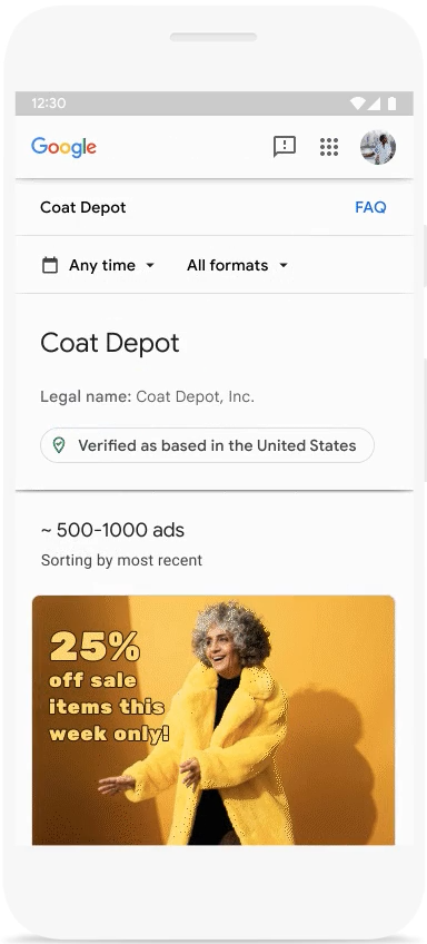 広告主についてのページを刷新し、広告の公開性を強化しています。ユーザーは”About this ad"メニューから開示された情報にアクセスでき、特定の広告主によって過去30日間に配信された広告を閲覧可能です。たとえばあなたがあるコートについての広告に興味を持ったにも関わらず、そのブランドが何かわからなかったとしましょう。「広告主ページ」があれば、あなたは商品を購入したりサイトを訪問する前に広告主について知ることができます。