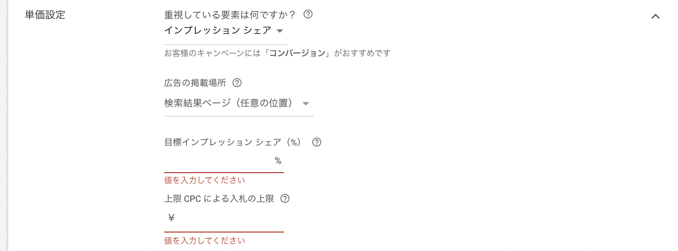 新しく作成する場合は、単価設定部分のプルダウンを開き「インプレッションシェア」を選択します。