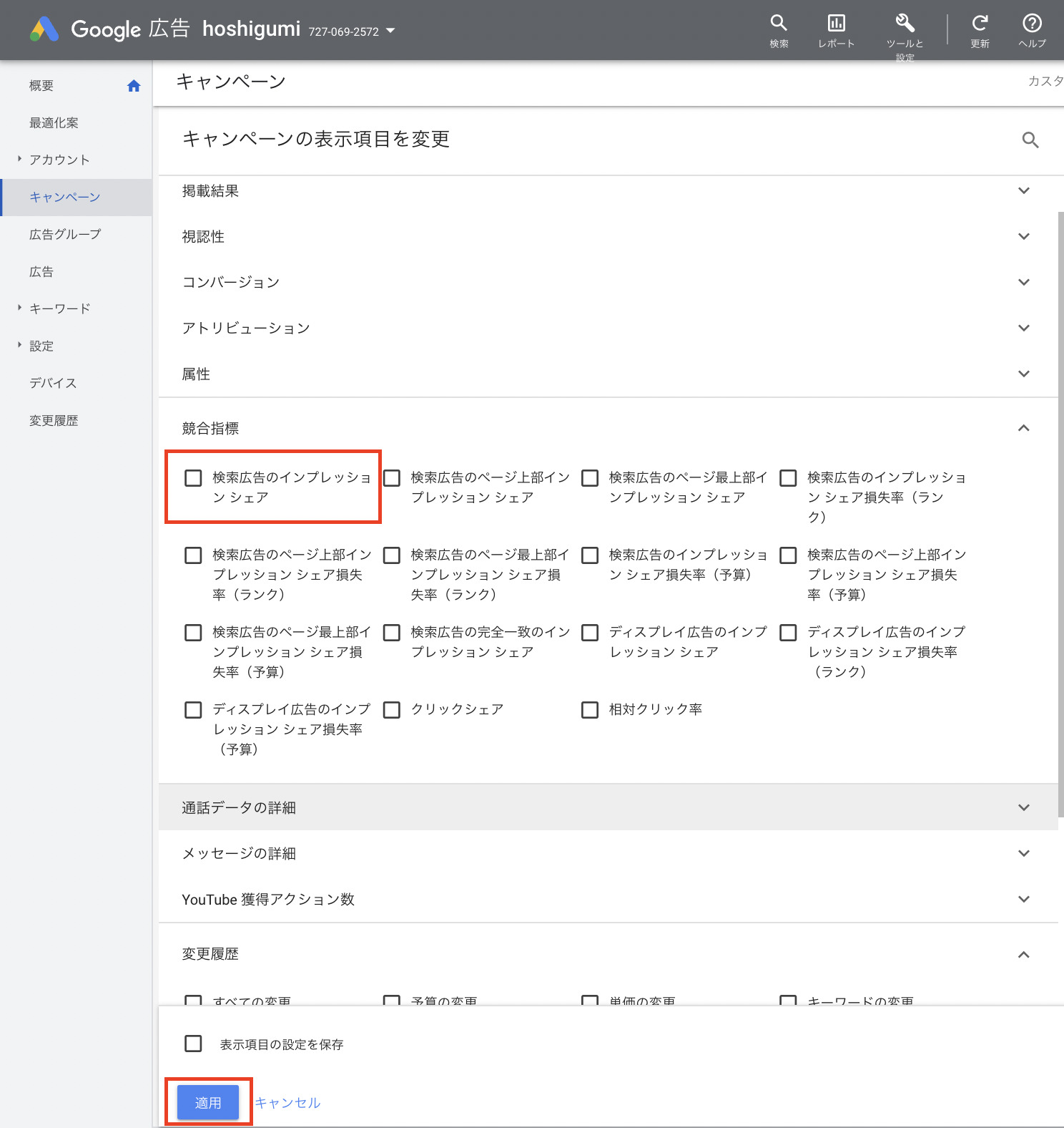 「検索広告のインプレッションシェア」を選択し「適応」をクリックすることでレポートに表示されます。