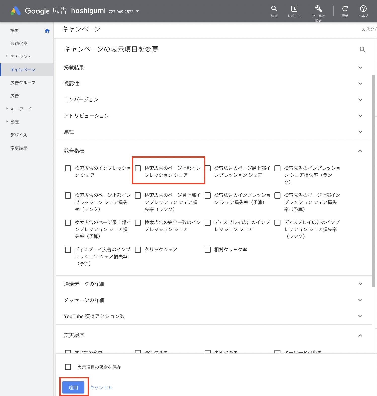 「検索広告のページ上部インプレッションシェア」を選択し「適応」をクリックすることでレポートに表示されます。