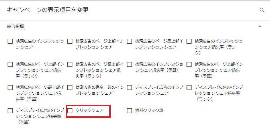 クリックシェアはキャンペーン、及び広告グループの表示項目に追加することで確認が可能です。