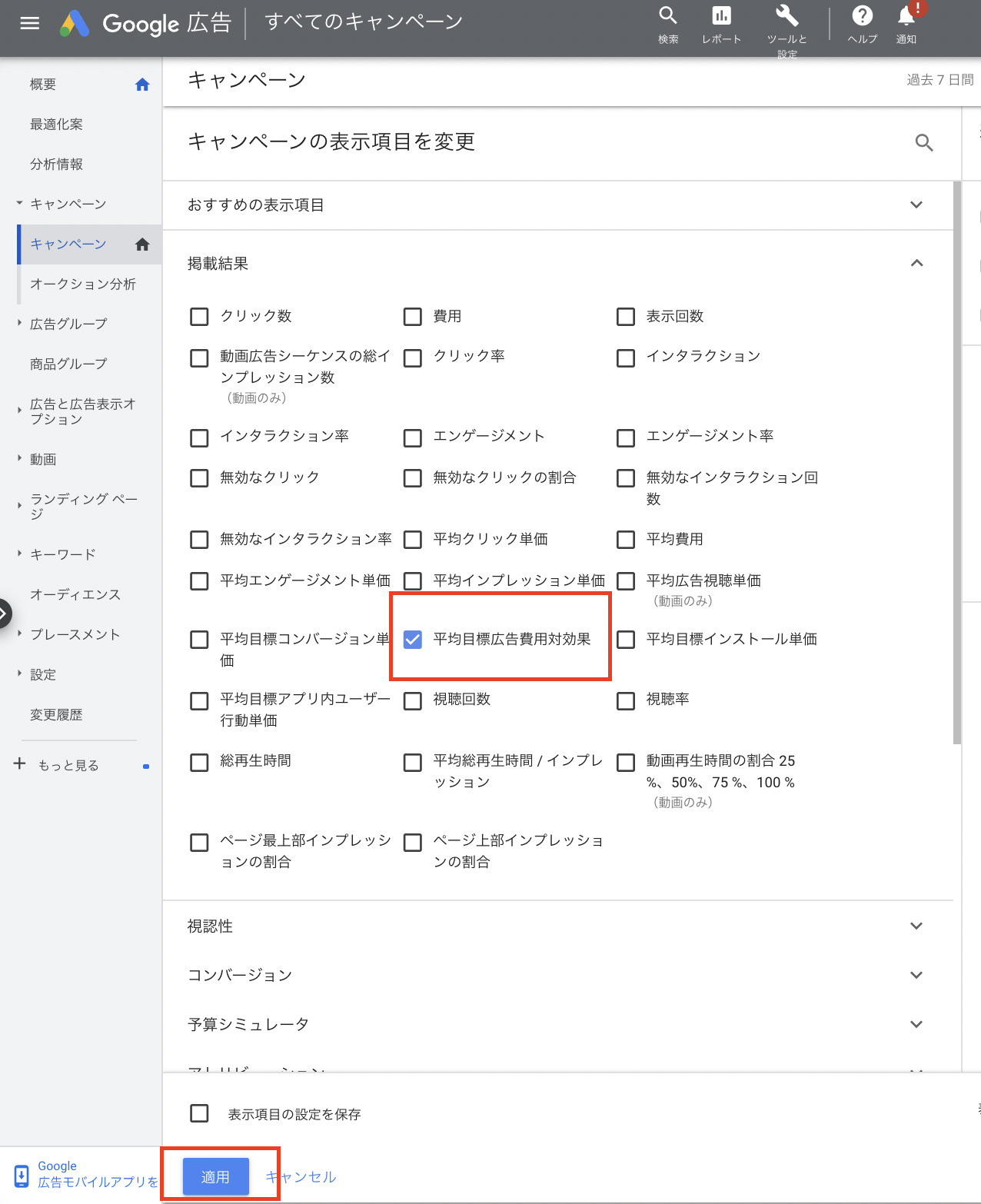 表示項目の編集画面が現れますので「平均目標広告費用対効果」を選択し「適応」をクリックしたらレポート画面に表示されるようになります。
