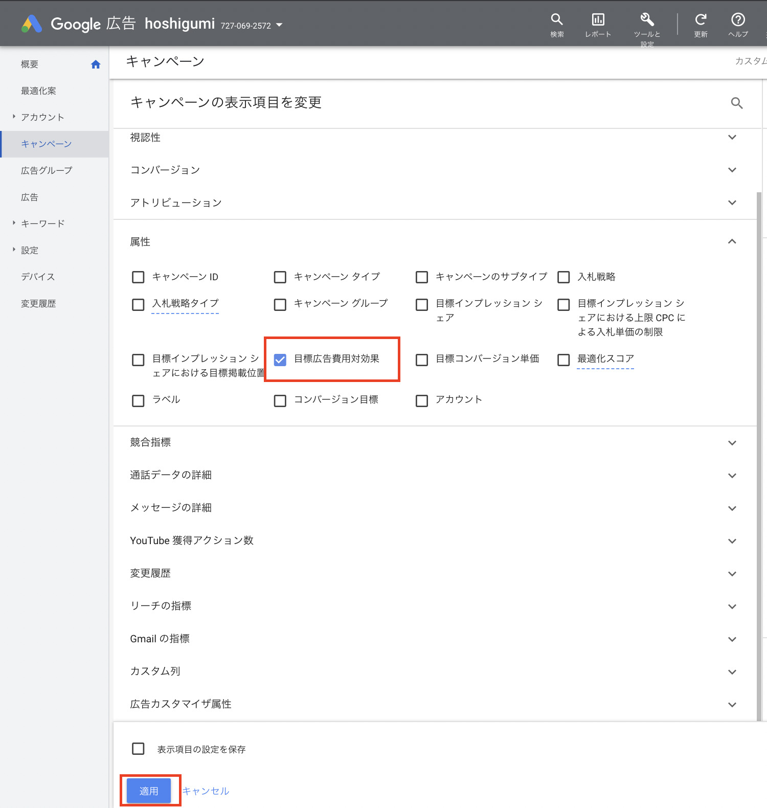 「目標広告費用対効果」を選択し「適応」をクリックすることでレポートに表示されます。