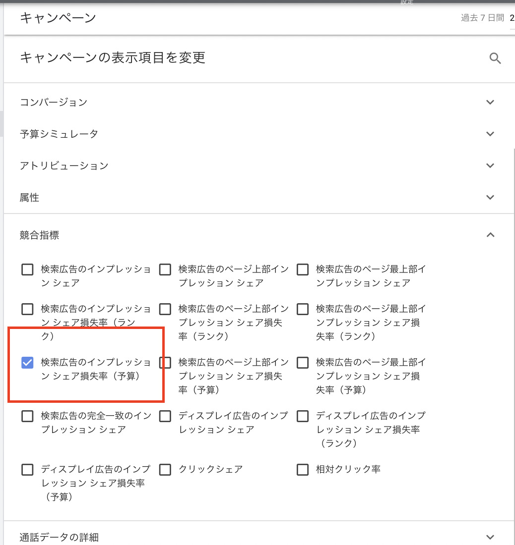 表示項目の編集画面が現れますので「検索広告のインプレッションシェア損失率(予算)」を選択します。