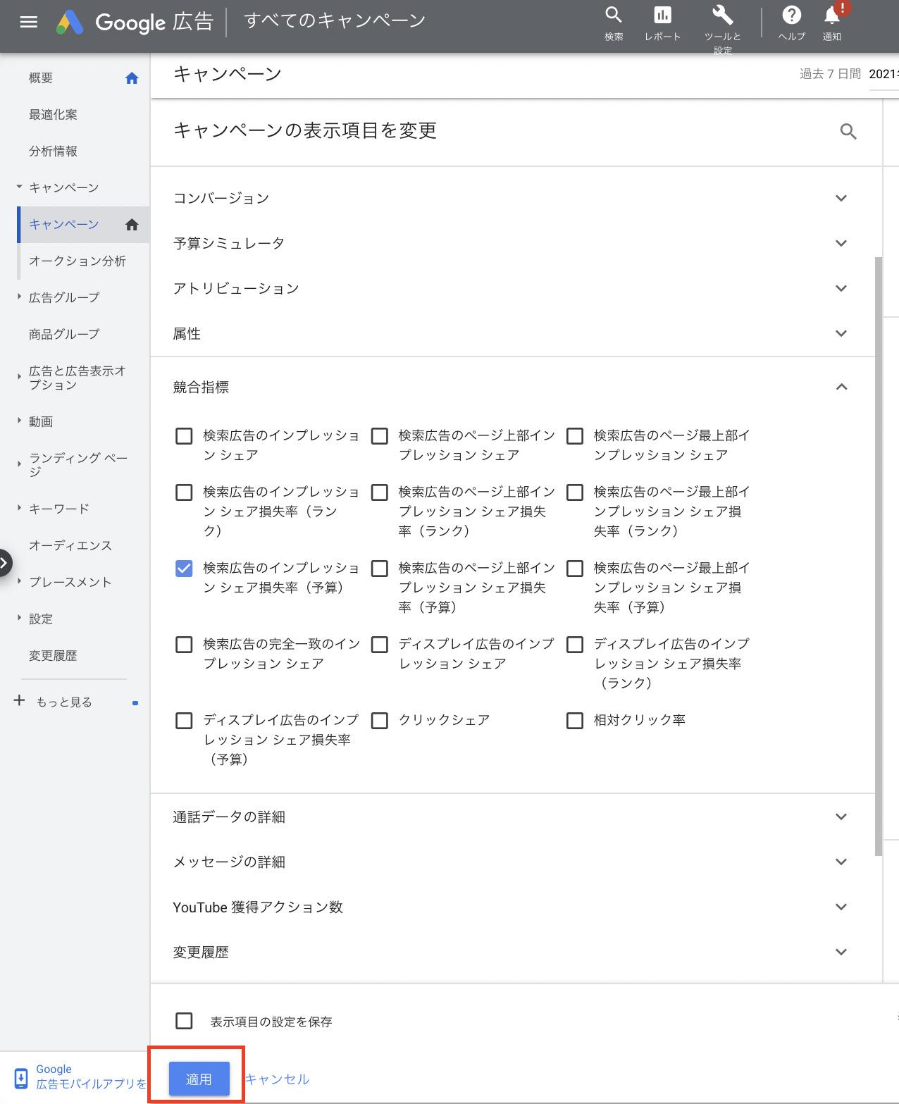 検索広告のインプレッションシェア損失率(予算)の確認方法