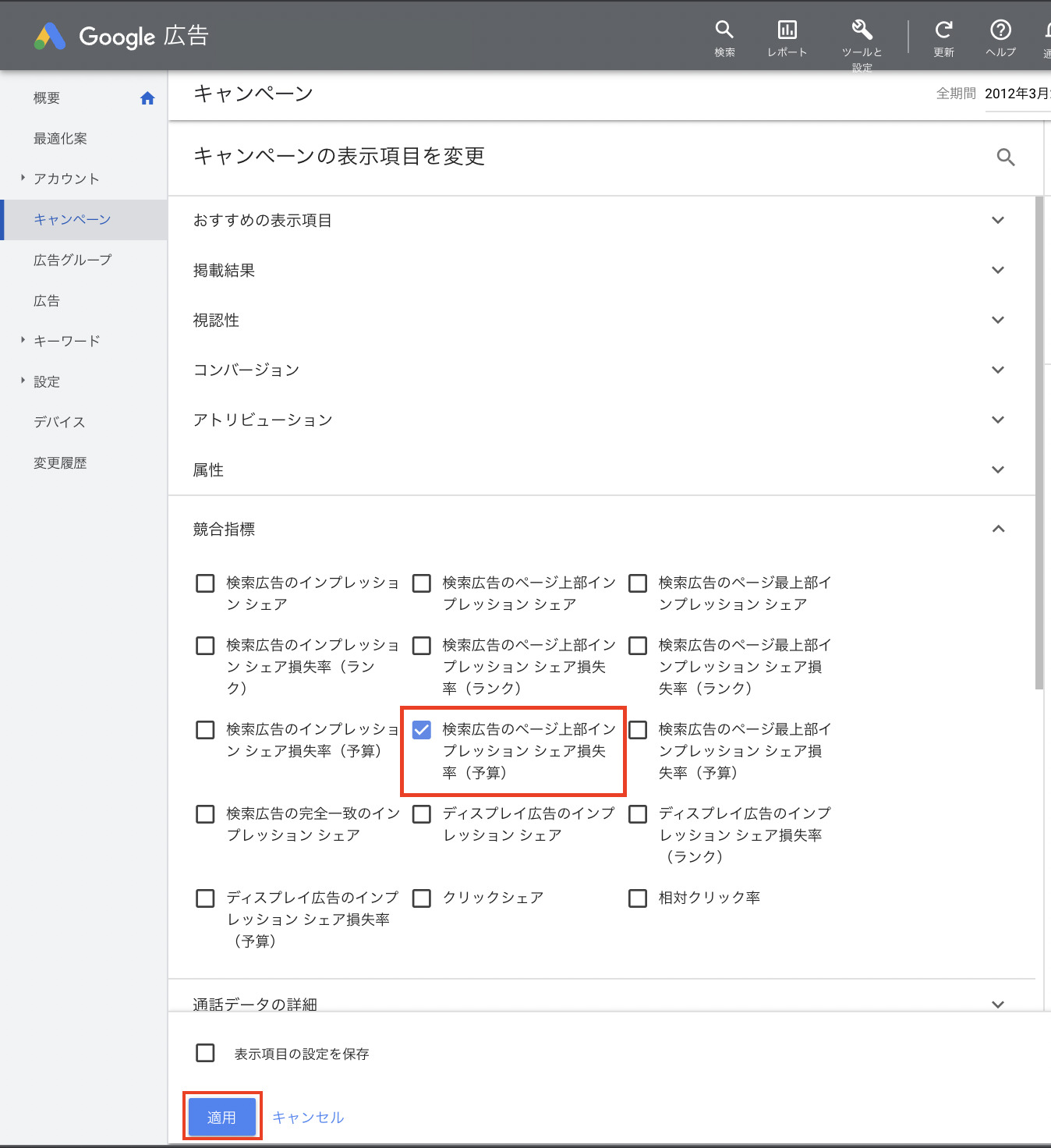 検索広告のページ上部インプレッションシェア損失率(予算)の表示列への追加方法