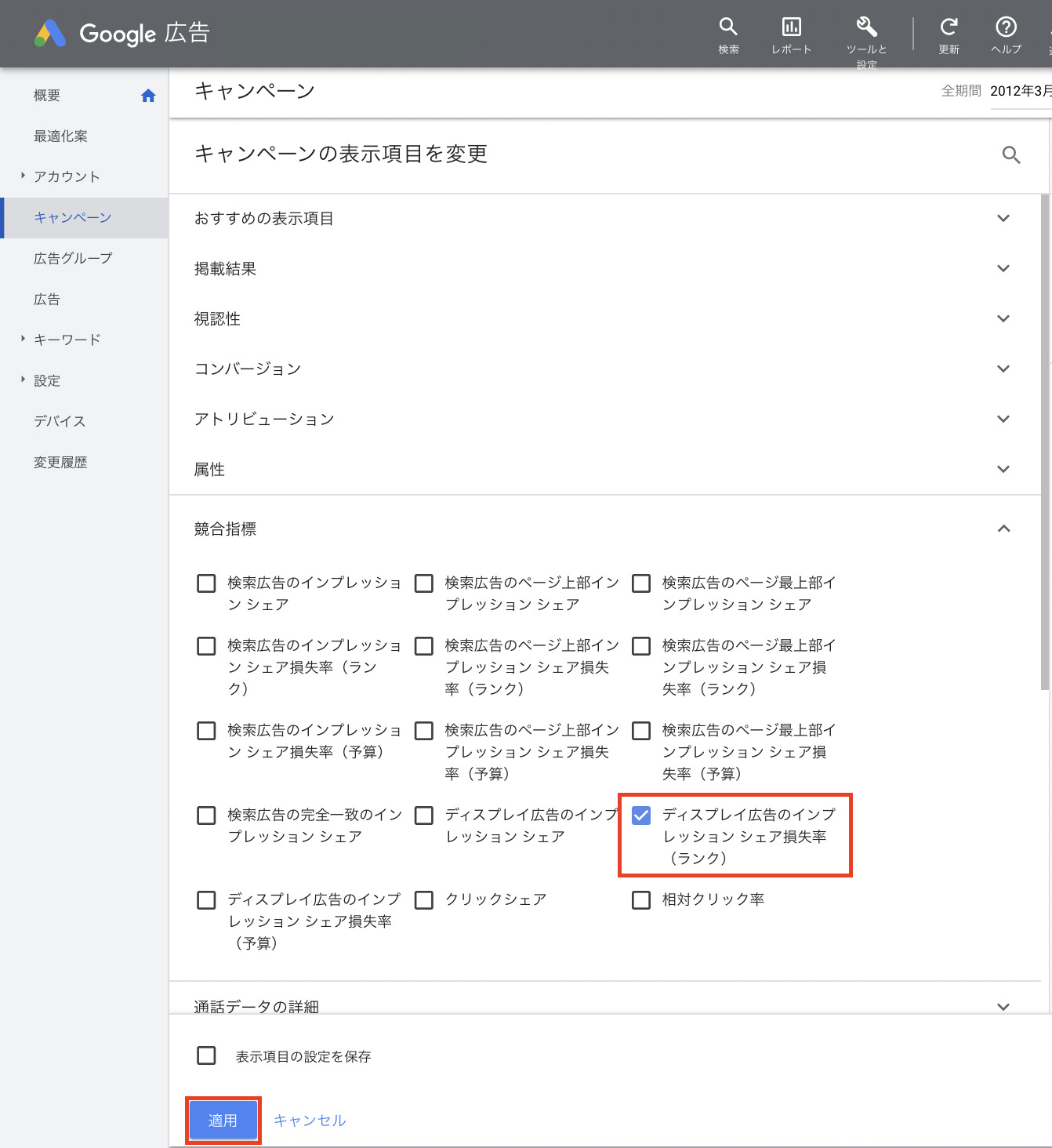 「ディスプレイ広告のインプレッションシェア損失率(ランク)」を選択し「適応」をクリックすることでレポートに表示されます。