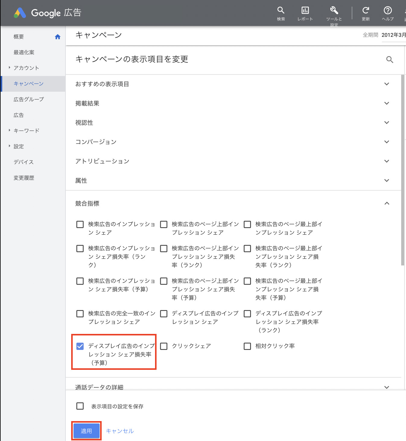 「ディスプレイ広告のインプレッションシェア損失率(予算)」を選択し「適応」をクリックすることでレポートに表示されます。
