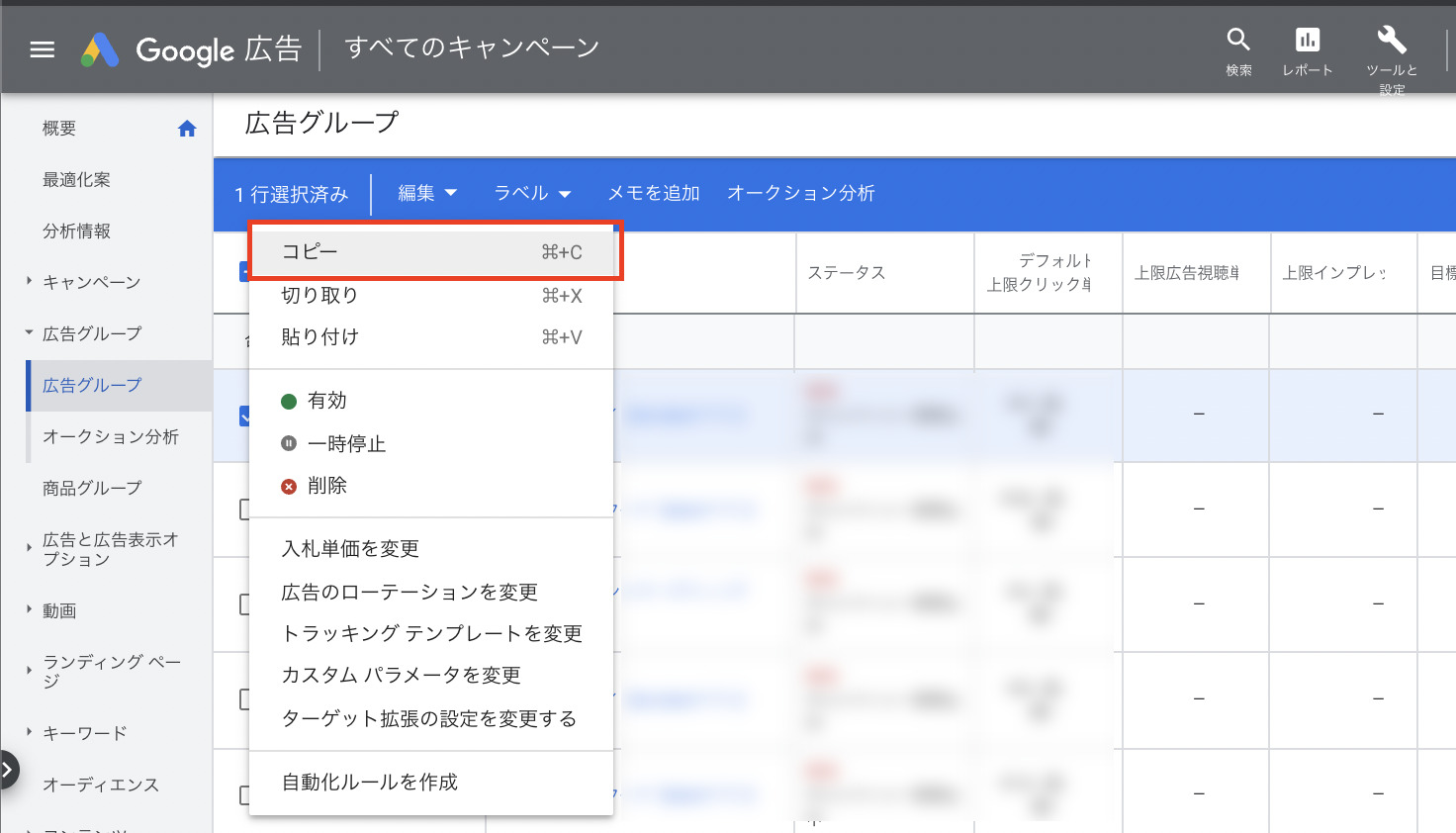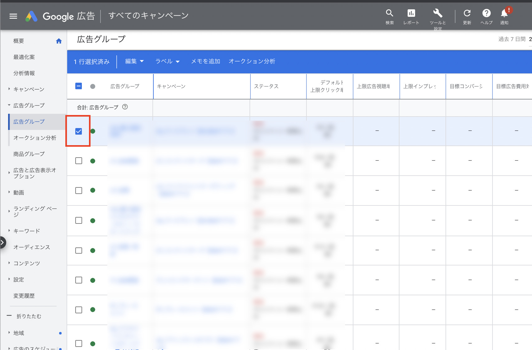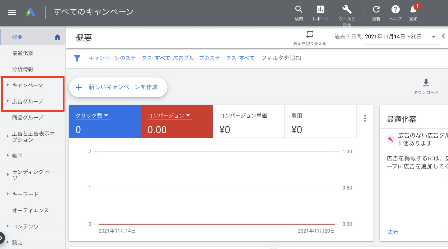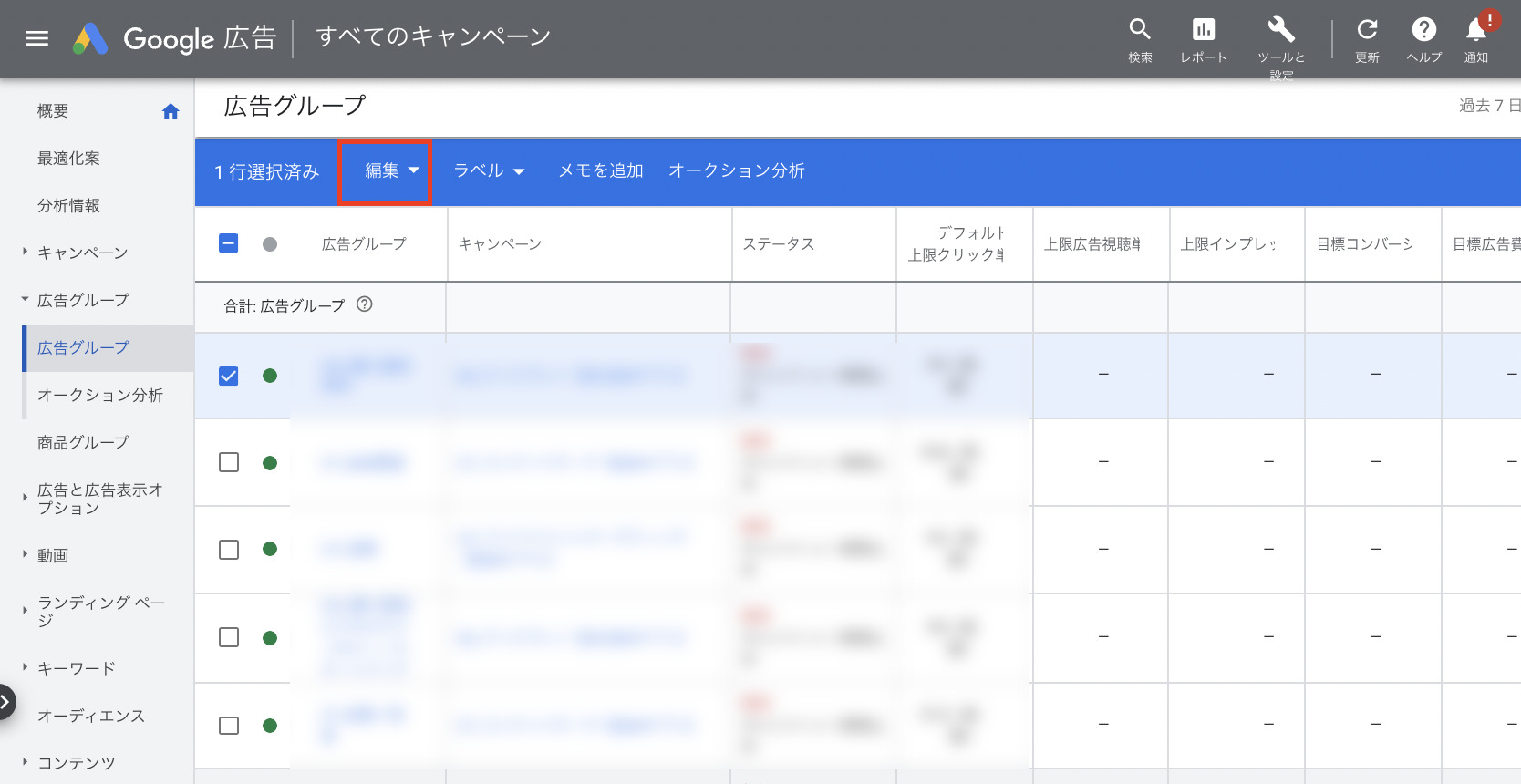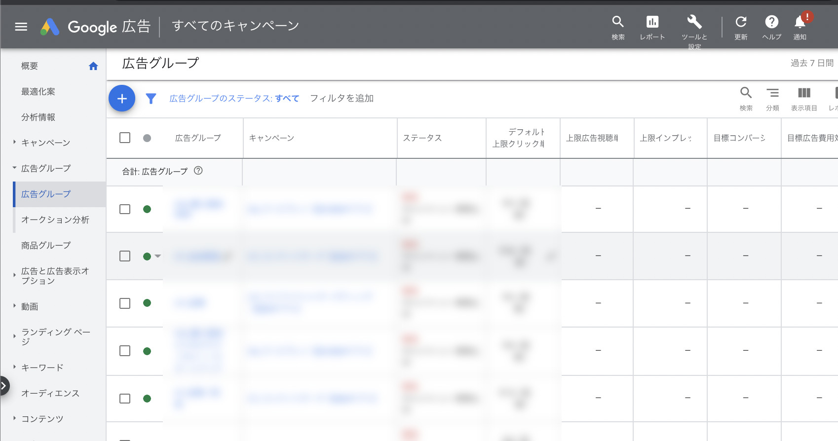 Google 広告で「キャンペーン」「広告グループ」タブに移動します。