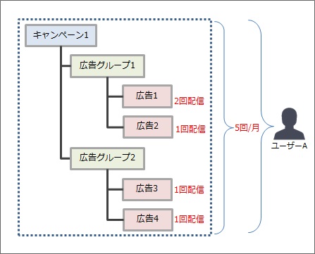 ユーザーAに対して、今月すでにキャンペーン1の広告(広告1~4)が5回配信された。