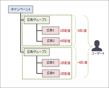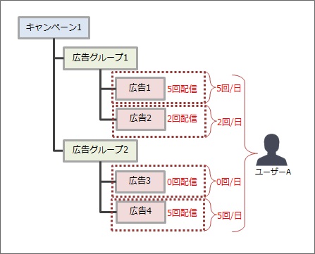 • 広告グループ1の広告(広告1~2)は、今週中はもうユーザーAには配信されない(上限回数に達したため)。