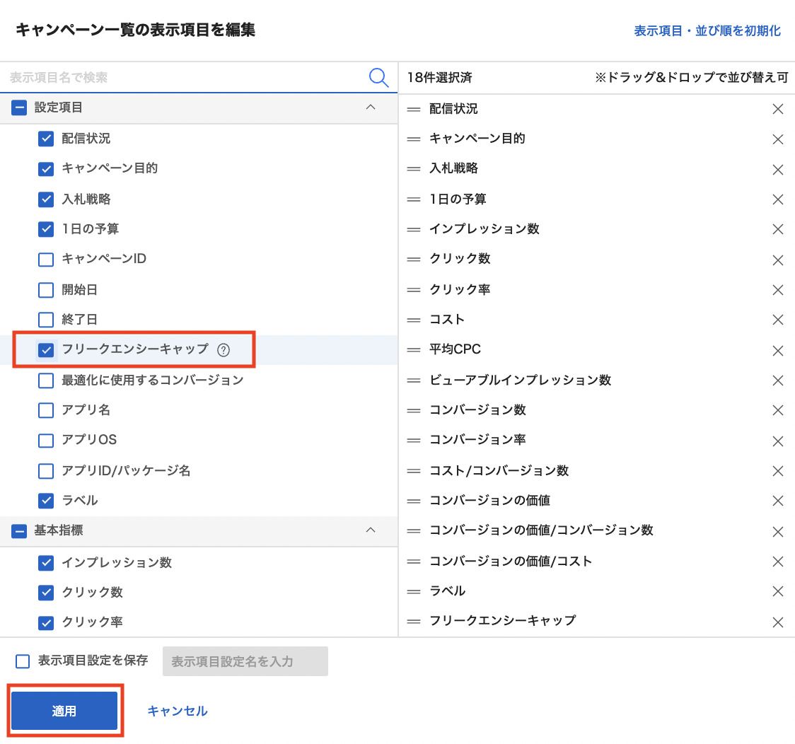 「設定項目」の項目から「フリークエンシーキャップ」を選択し適応をクリックしたら完了です。