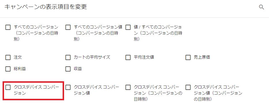 クロスデバイスコンバージョンは、広告のレポート列に表示することで確認が可能です。